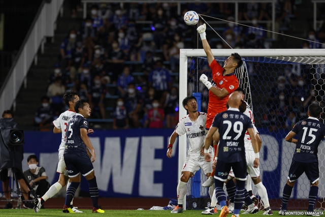 23分にはバックパスが短くなったところを狙われたが、初動よく飛び出したGK後藤雅明選手が防ぐなど、流れを維持。そして迎えた26分、FKで國分伸太郎選手のボールを山田康太選手がヘディングで合わせ、2点目を奪った。