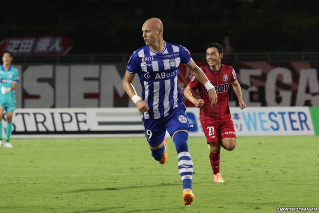 0-0で折り返した後半、モンテディオは距離感を近くし、ショートパスでテンポを上げながらスペースを使うシーンを増やしていった。すると51分、獲得した中央左サイド寄りのFKで、國分選手が左隅に正確にコントロールしたシュートを決め、モンテディオが先制した。