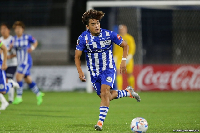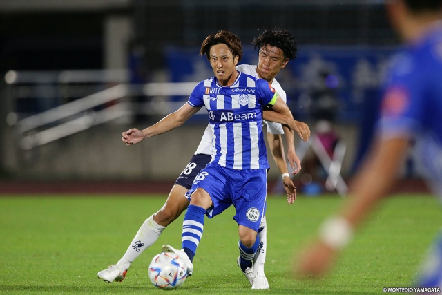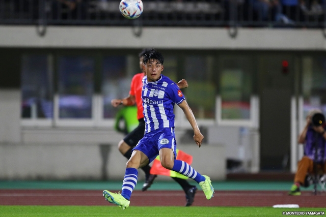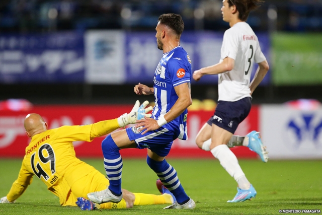 モンテディオはさらに攻撃を続け、30分には河合秀人選手の強烈なミドルシュートが左ポストを直撃。32分にも深い位置から河合選手が送ったクロスに藤田息吹選手が合わせたが、こちらは右ポストを当たり跳ね返った。42分には藤田選手のくさびからきれいな形で崩し、最後はデラトーレ選手のスルーパスに加藤選手が抜け出した。シュートはゴールネットを揺らしたが、判定はオフサイドとなり、モンテディオは相手を圧倒しながら前半を0-0で折り返した。