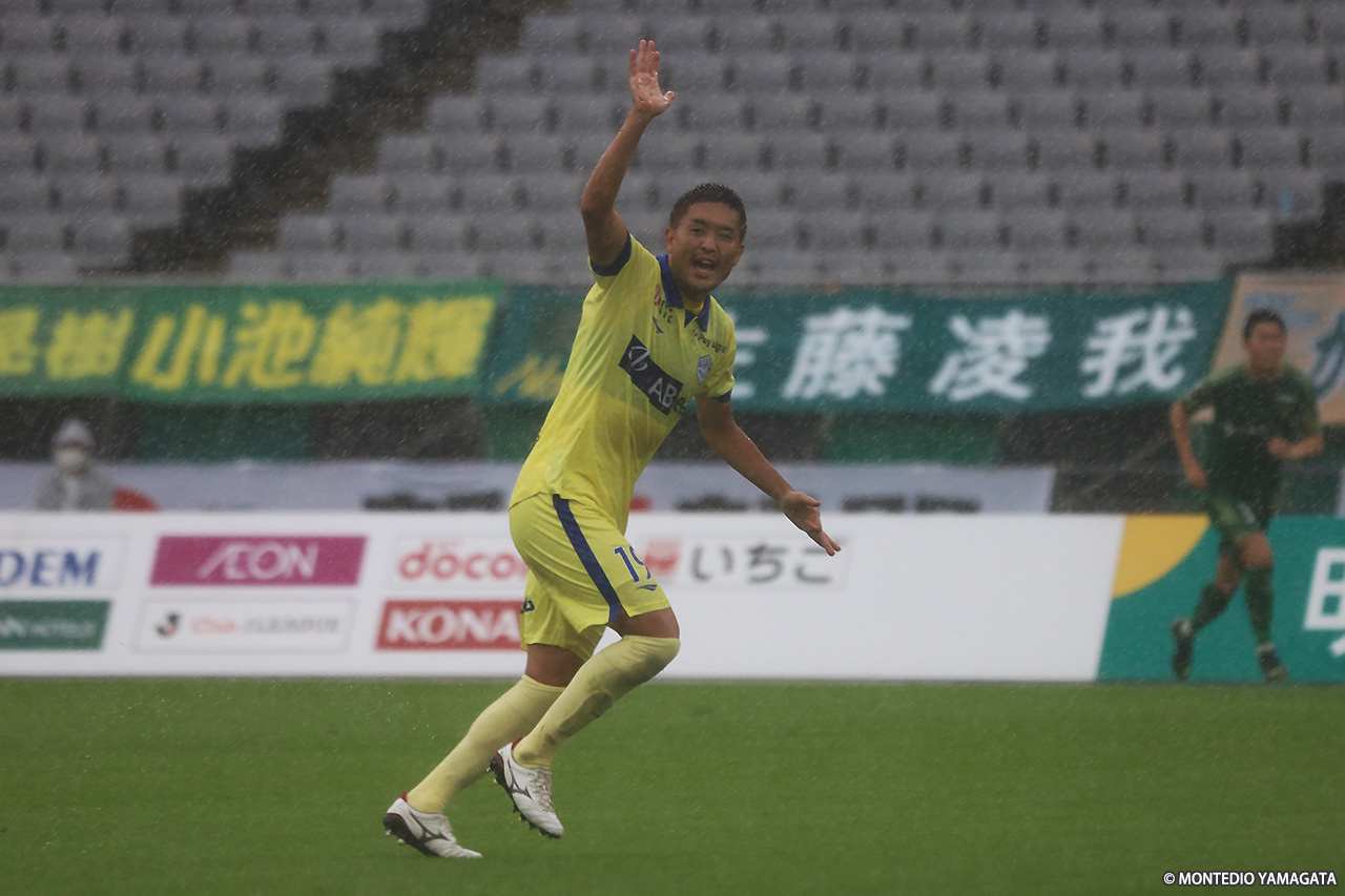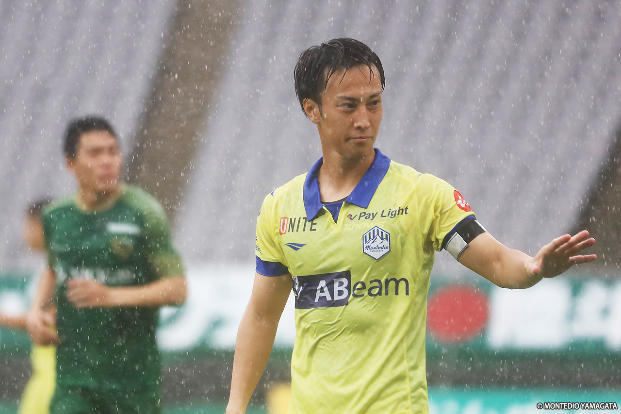 ハーフタイムをはさみ、後半開始時にはさらにピッチの水が引いたが、立ち上がりから東京Vに流れを奪われる。東京Vが押し込んでいた47分、バスケス バイロン選手のクロスを弾き返したが、そのセカンドを奈良輪雄太選手に蹴り返された。モンテディオも49分、南秀仁選手のシンプルな縦パスからディサロ選手がシュートまで持ち込んだ。51分にも河合選手が右サイドを突破してクロスを上げ、跳ね返りを拾った松本怜大選手がミドルシュートを放ったが、いずれも決めきれなかった。