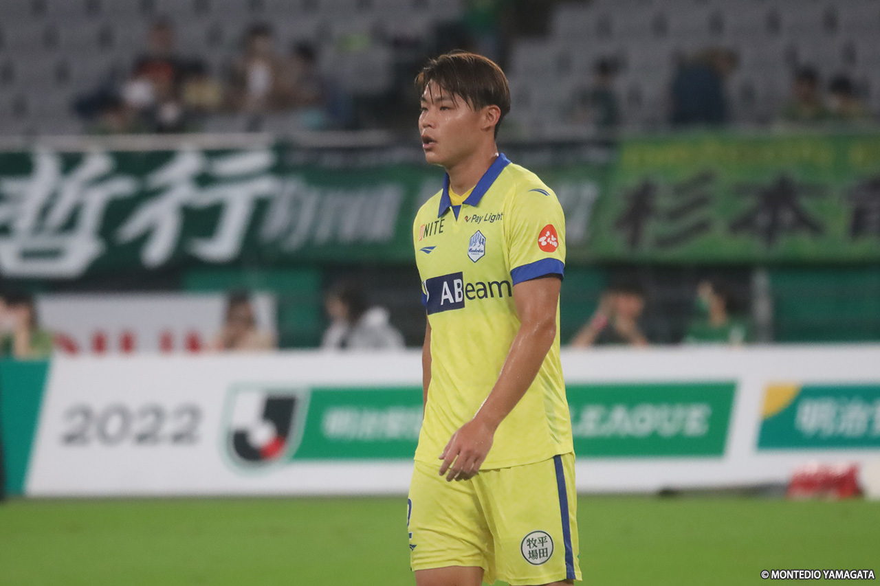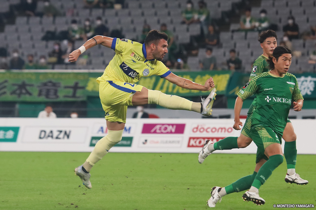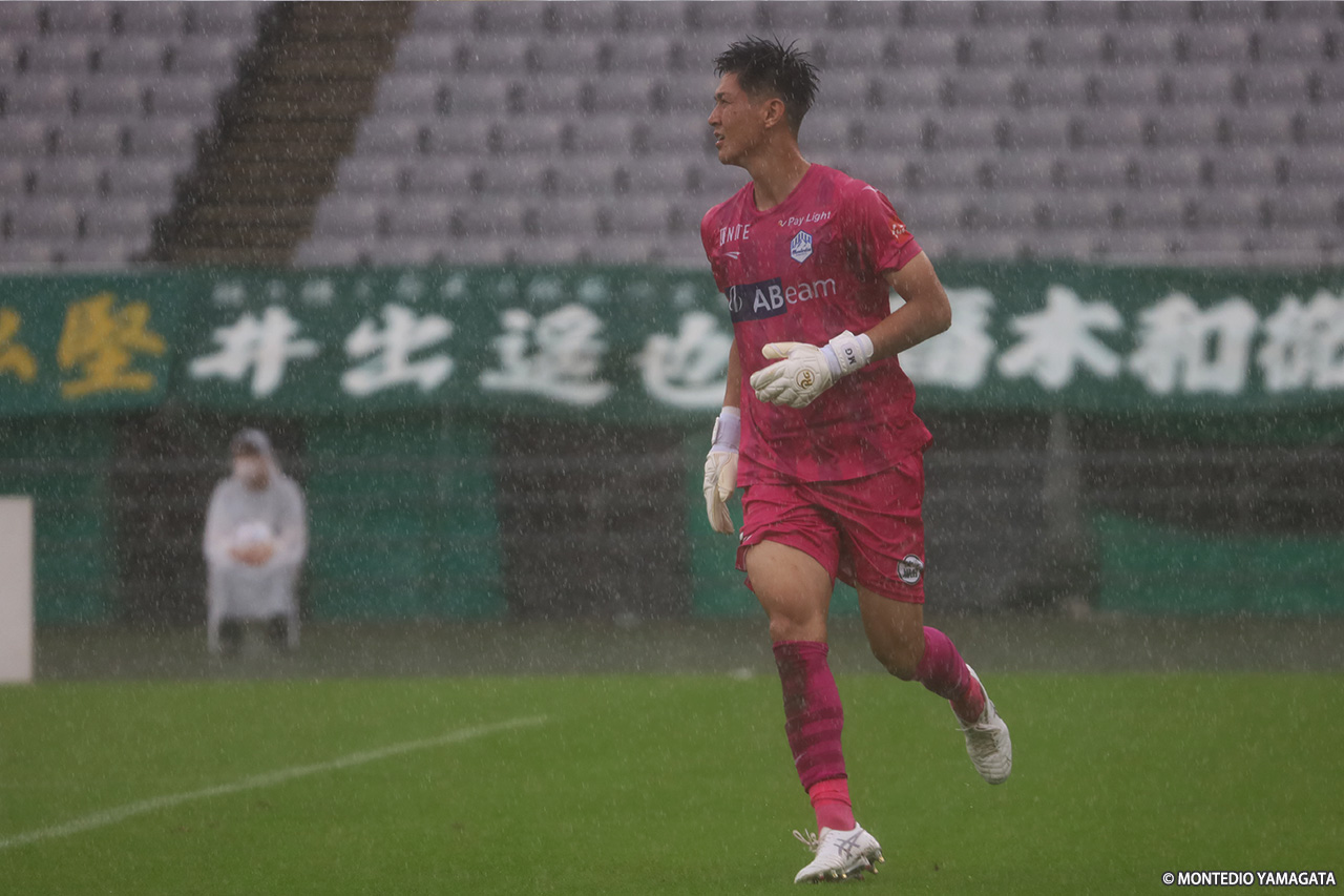 その後もモンテディオかなかなか攻めに転じることができず、東京Vが押し込むなか、34分にはバスケス バイロン選手のクロスから河村慶人選手にニアに飛び込まれたが、ここは野田裕喜選手がしっかり対応。アディショナルタイムにはFKから梶川選手に直接シュートを狙われたが、ここはクロスバーの上を超えていった。