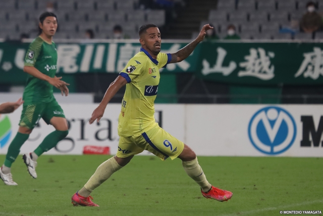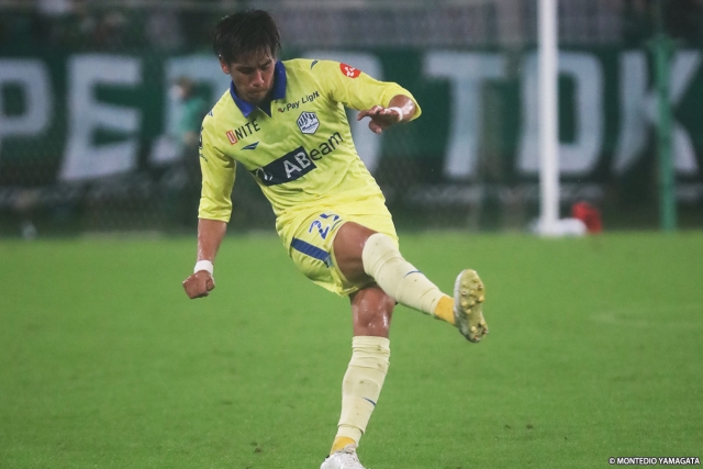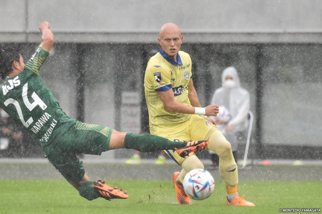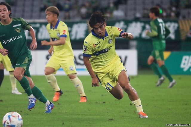 そのなかで、より条件を味方につけたのは東京Vだった。シンプルに相手陣内にボールを運んだり、高い位置からプレッシャーをかけるなど、モンテディオ陣内でのプレーを増やしていく。24分にはモンテディオの中盤でのミスからボールをつながれ、最後は梶川諒太選手にミドルシュートを枠内に打たれ、GK後藤雅明選手のセーブで切り抜けた。