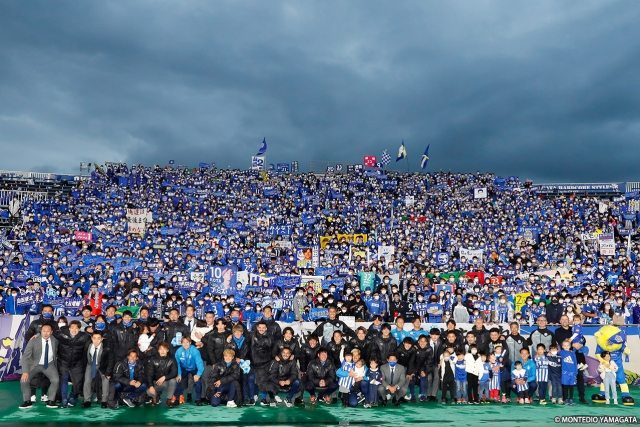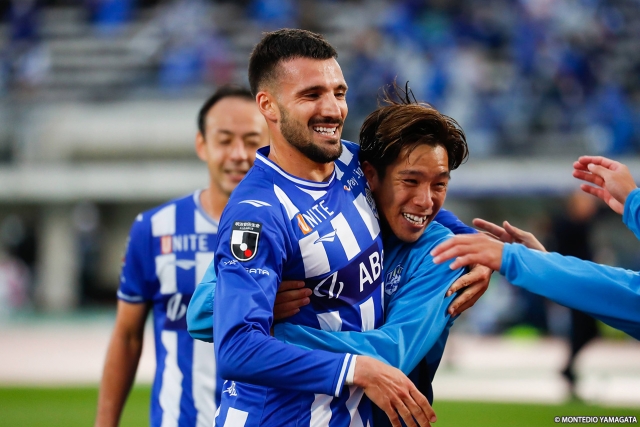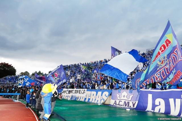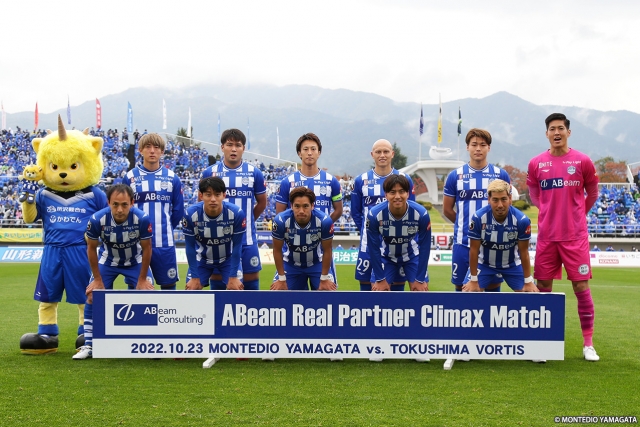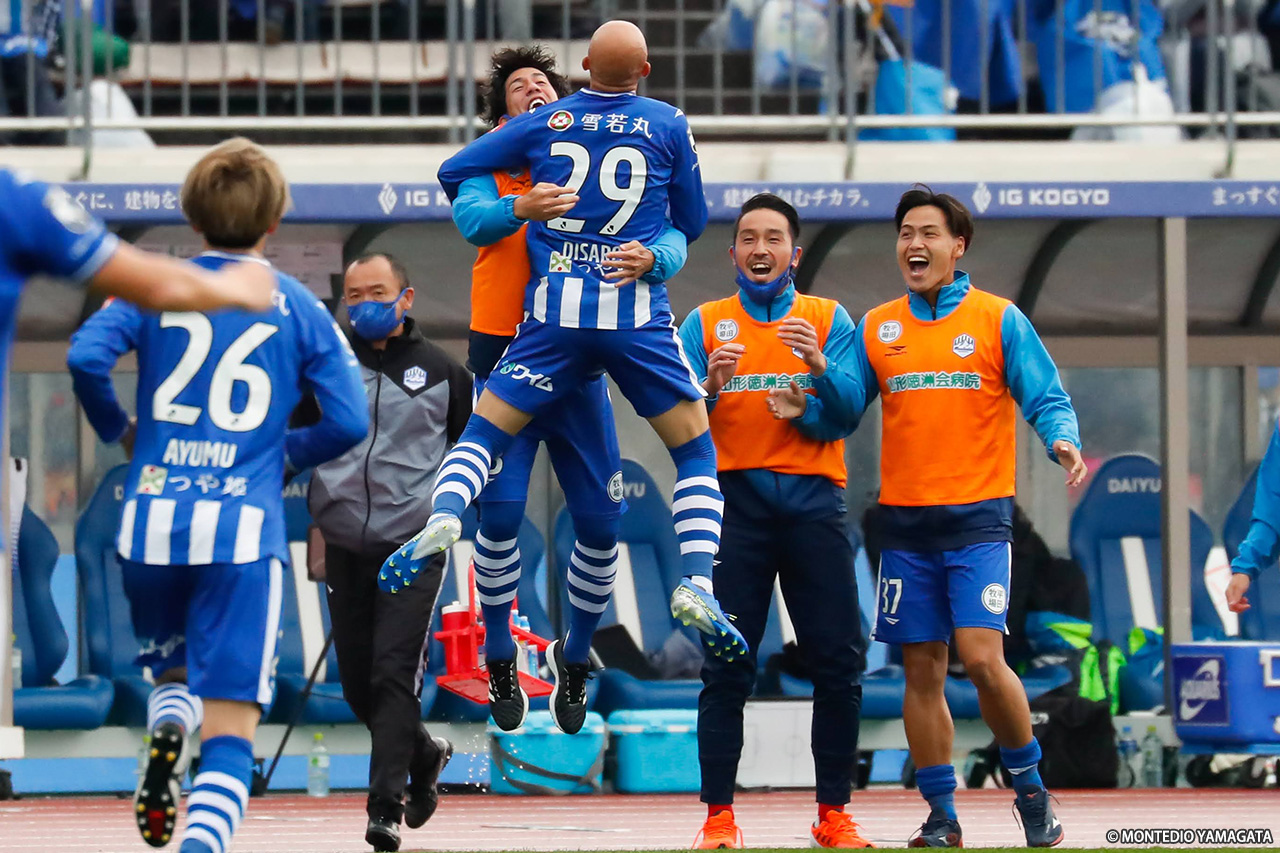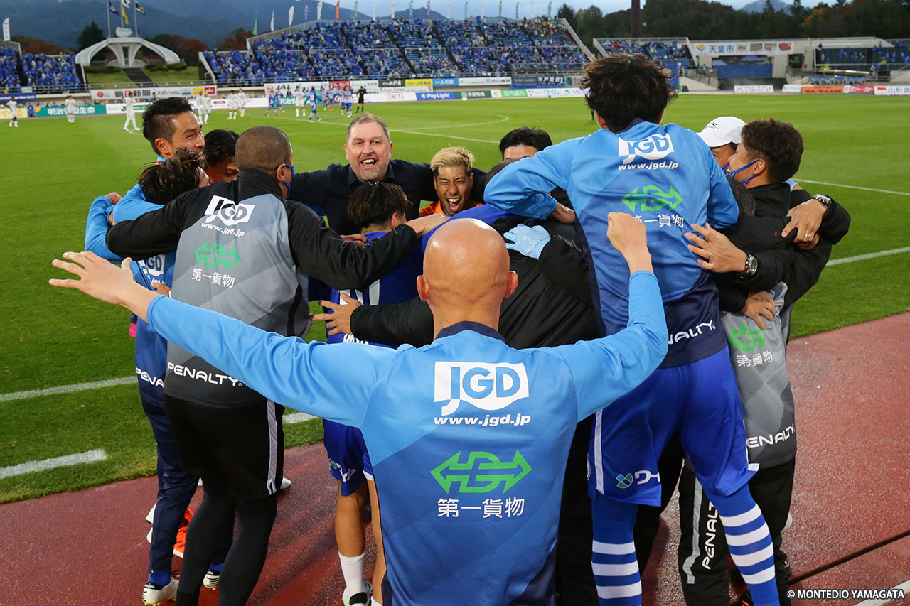 6位と勝点1差で迎えた今シーズン最終節は、6位・徳島ヴォルティスとの直接対決。モンテディオは前半に先制し、後半に追加点、さらにダメ押し点とゴールを重ね、3-0で勝利。7位・仙台がドローに終わったこともあり、モンテディオが6位に浮上し、クラブ史上3度目のプレーオフ進出を決めた。