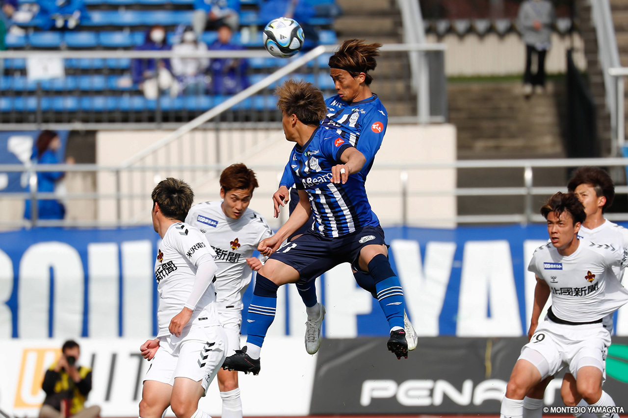 すると時間とともに金沢が反撃に持ち込むシーンが少しずつ増える。30分には右サイドからのクロスを成瀬がしっかりクリア。続く32分にも成瀬がクロスボールをクリアした。なんとか凌ぐも、徐々に金沢の守備に捕まりはじめ攻撃を受ける時間が増えてくる。