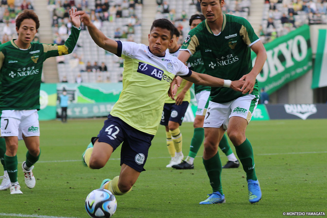 一方、東京Vは左ウイングのマリオ エンゲルスが喜岡の背後のスペースを何度も突き、危険なクロスも上がったが、モンテディオはゴール前で体を投げ出し、決死の守備で凌ぎ続けた。