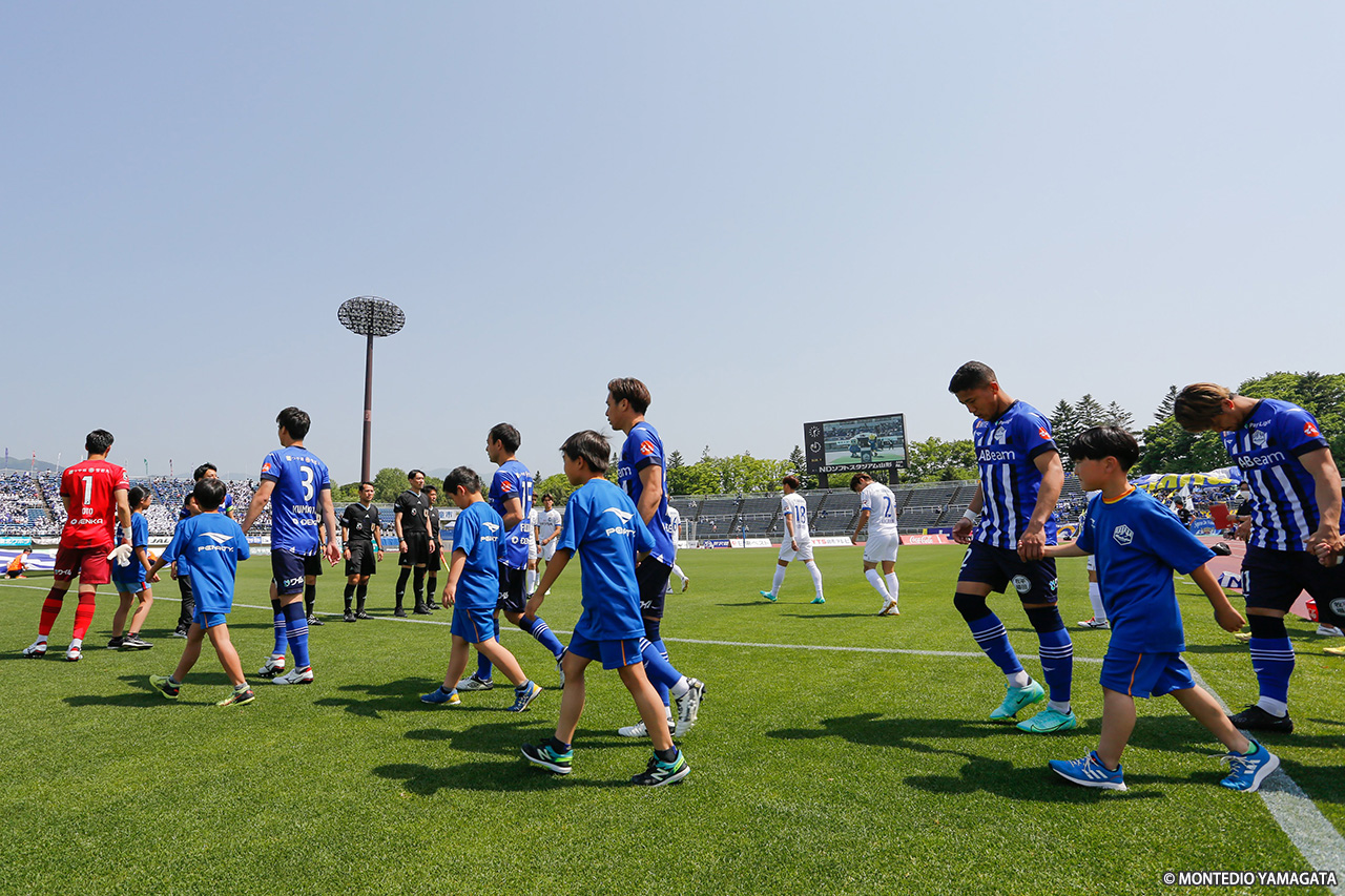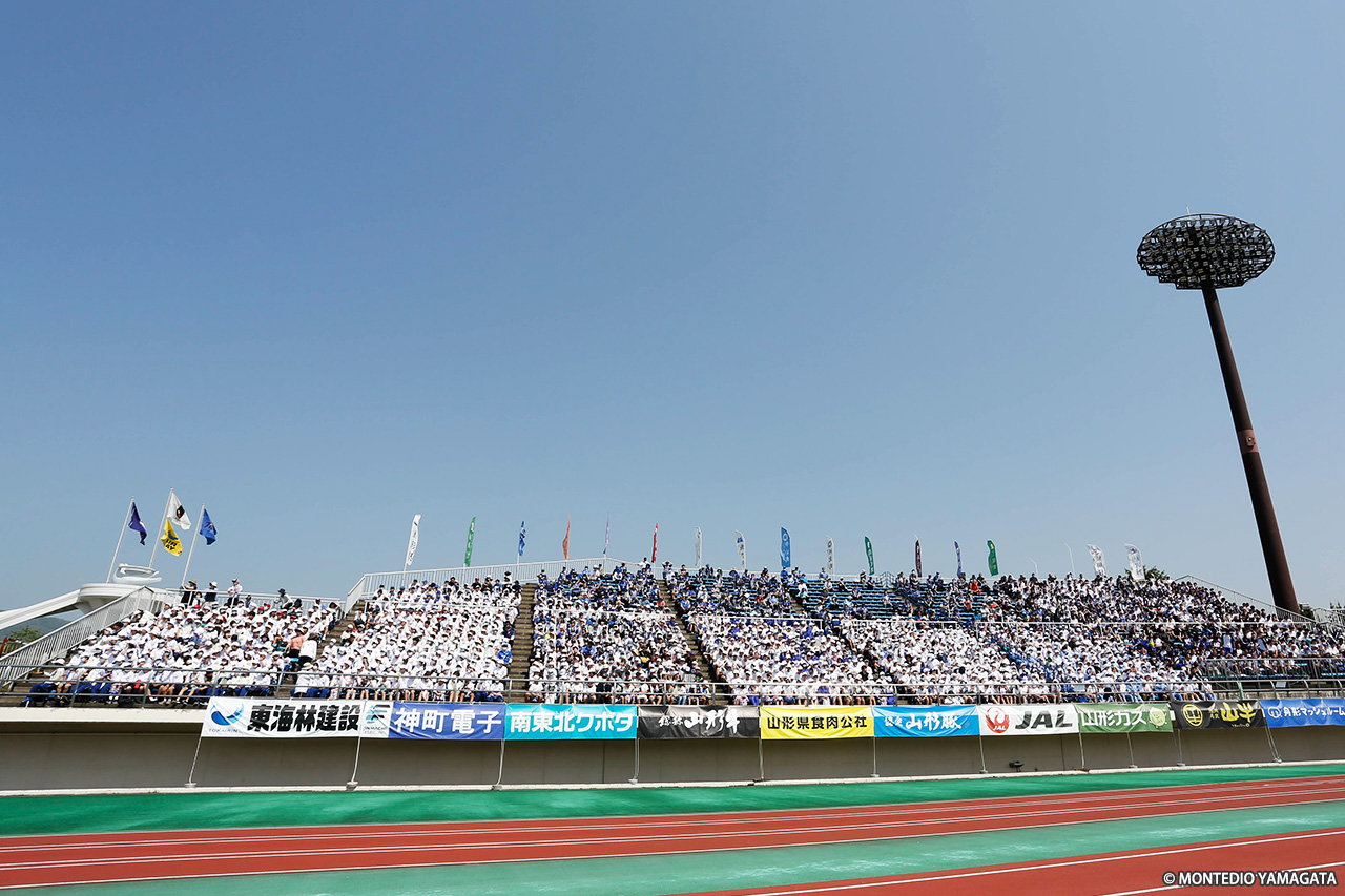 まずは、今日スタジアムに来ていただいたサポーターの皆さん、それから中継先のいろんな場所で応援をしていただいた皆さん、ありがとうございました。そして何より、山形県内から、幼稚園児から上は高校生まで、大勢の子供たちに集まっていただきました。間違いなく、彼らの大きな大きな声援が選手の足を動かしてくれたと思います。本当にありがとうございました。