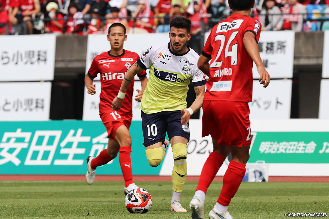 公式記録の気温29.2℃のなか、立ち上がりから目立ったのはモンテディオの守備への意識だった。ボールを動かされても2度、3度としつこく食らいつき、押し込まれてもボールに出続けた。10分にはポストで受けた藤本佳希からのスルーパスにチアゴ アウベスが抜け出しチャンスを迎えたが、ペナルティーエリアに入ったところで対応され、シュートを打てなかった。