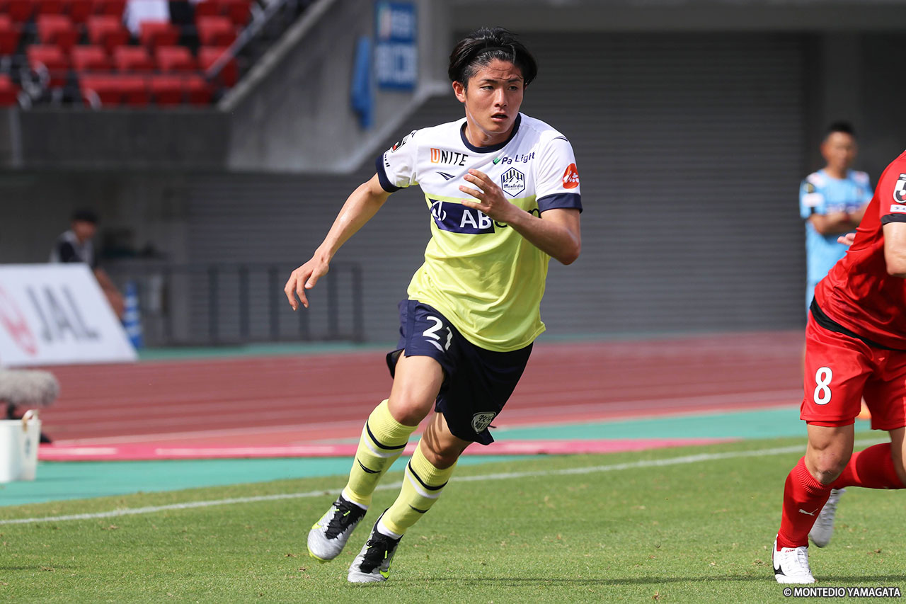 その後もモンテディオは各選手がスペースでボールを受けながら熊本のプレッシングをかわしていたが、90分+6、自陣右サイド、フリーでボールを持った川井が前方へフィードを送ると、相手の背後へ飛び出した横山がしっかりと収め、ドリブルで加速。GKとの1対1に持ち込むと、さらに縦にかわし角度のない位置からゴール内に流し込んだ。このダメ押しの3点目が決まった直後、試合終了の笛が鳴った。