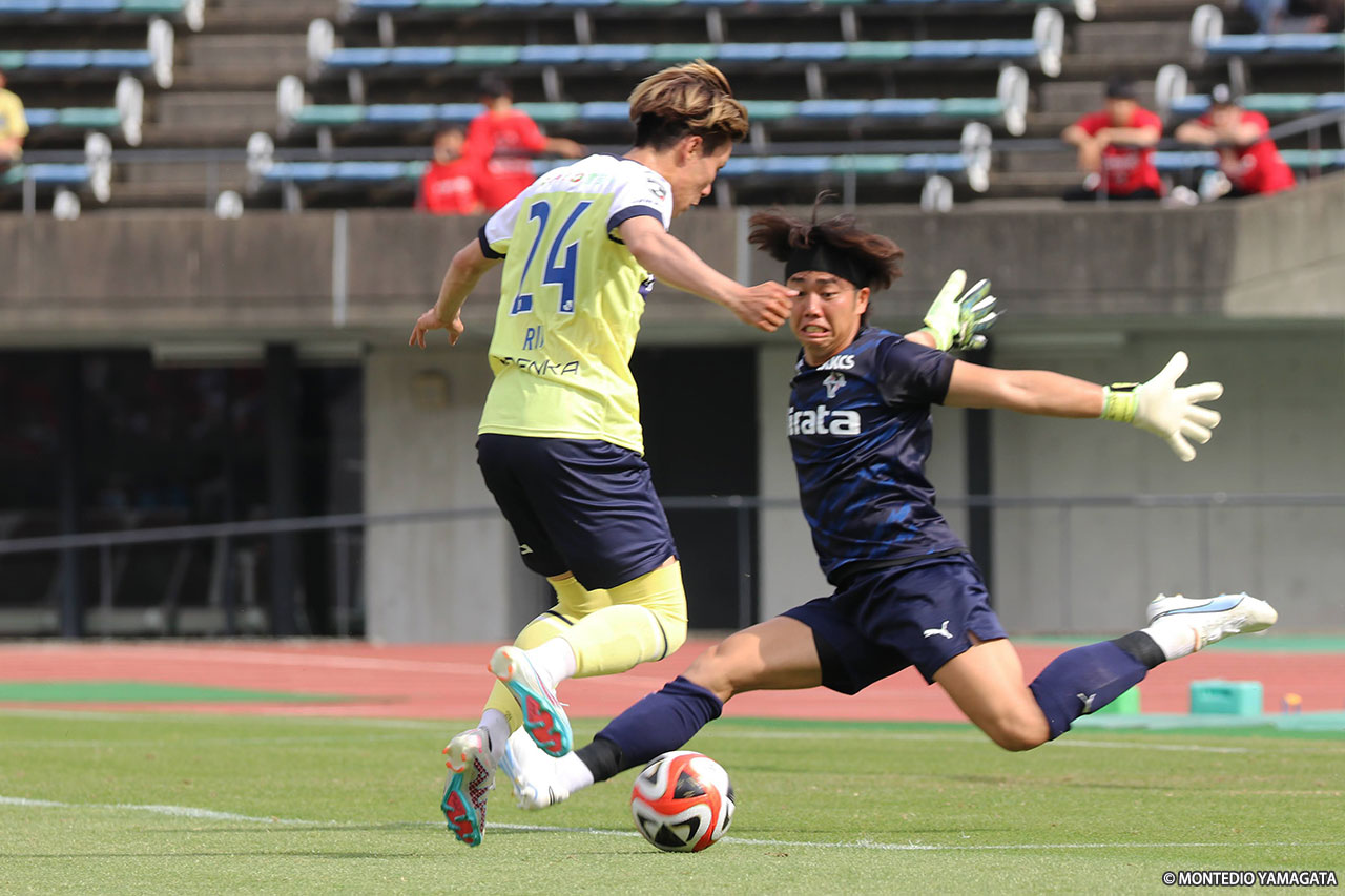 このビッグチャンスの直後、一転、モンテディオがピンチに。松岡瑠夢のマイナスのクロスから粟飯原がシュート。GK後藤雅が弾いたこぼれ球をもう一度粟飯原が狙ったが、今度は熊本雄太が立ちはだかった。