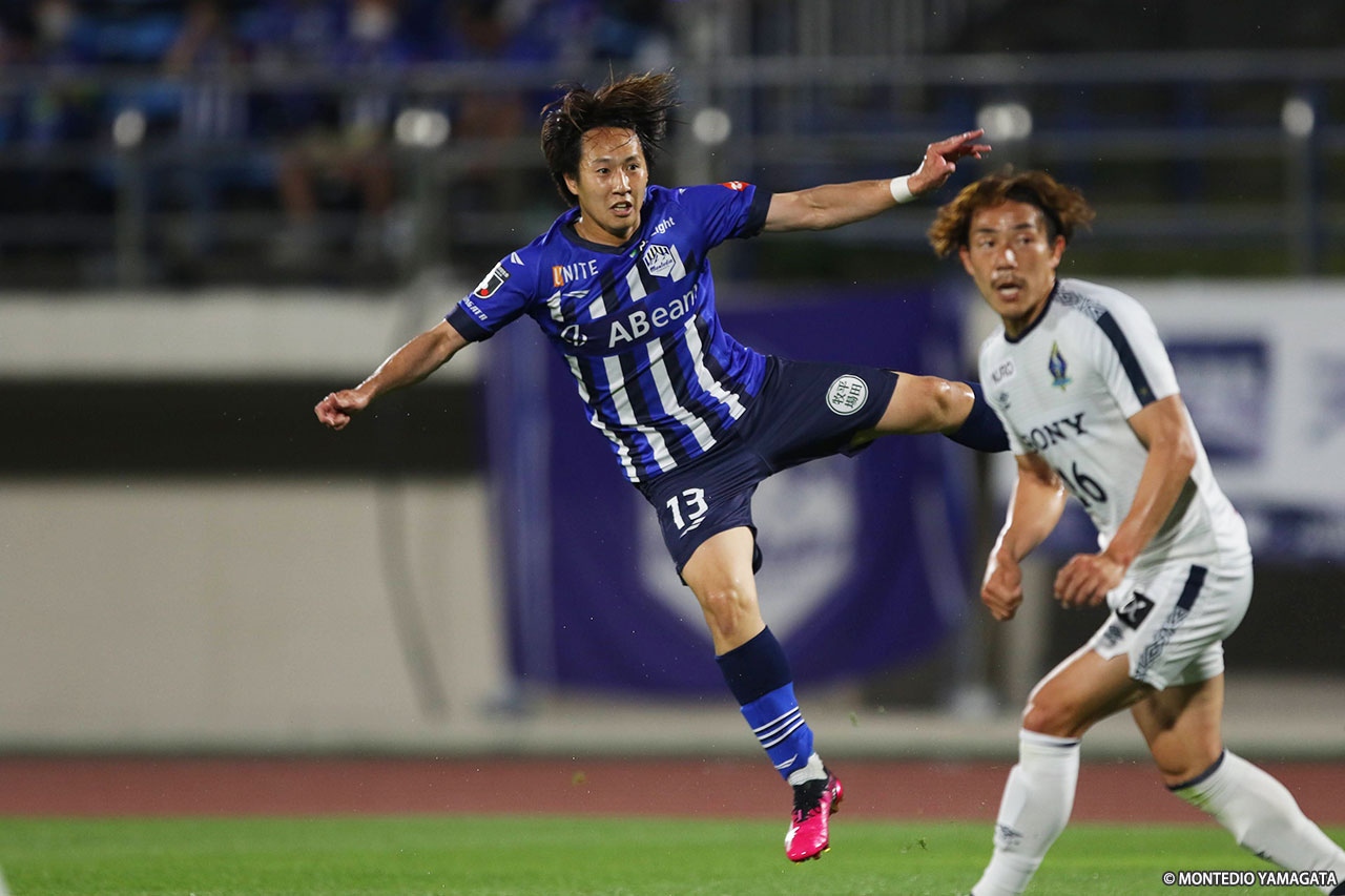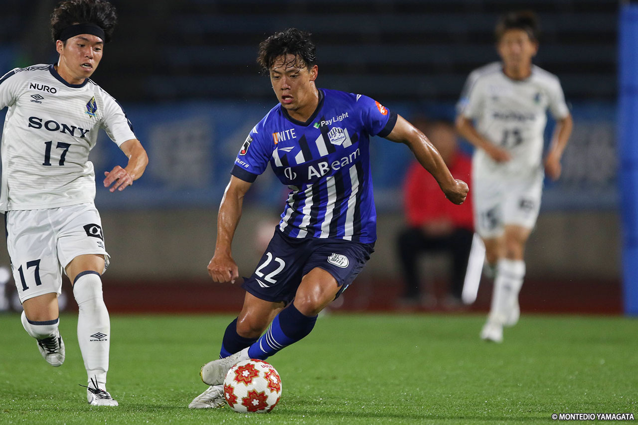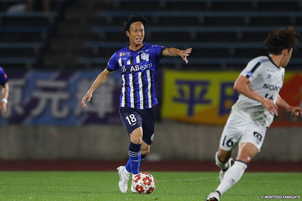 モンテディオは33分にも、くさびを受けた高橋が落とし、山田拓巳が入れたアーリークロスで逆サイドの河合が飛び出したが、ここはオフサイドとなった。すると、ここでモンテディオにアクシデント発生。高橋が足を痛め、42分に荒川永遠と交代となった。