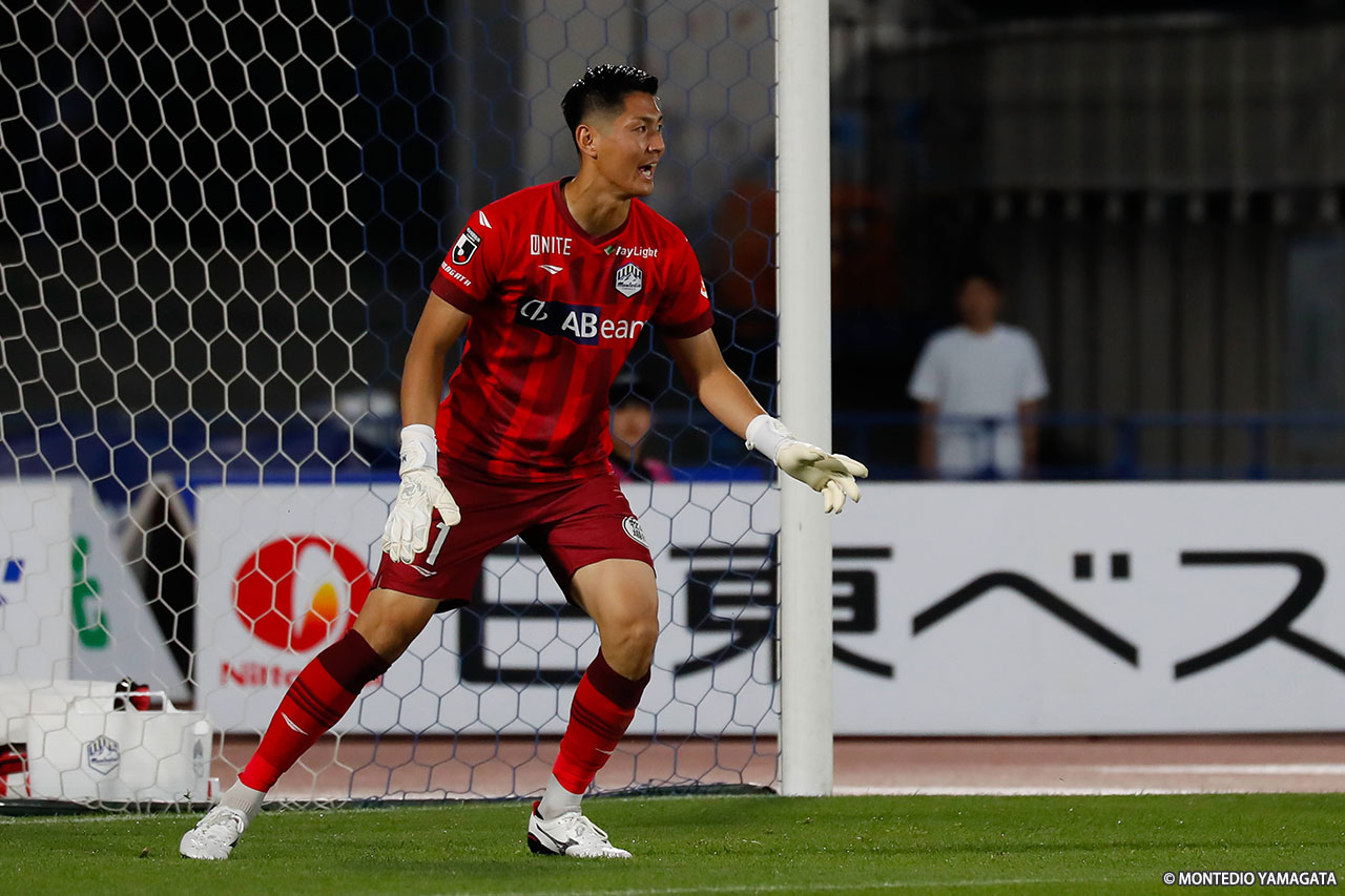 このあとは双方が攻防を繰り広げていたが、モンテディオがハイプレスを狙ったところで東京Vにロングパスから背後を取られるシーンが増えていく。23分には稲見哲行にミドルシュートを打たれたが、ここは枠外。さらに28分にはクロスからバスケス バイロンにシュートを打たれ、29分には東京VのCKの流れから山田剛にシュートを打たれたが、いずれもGK後藤雅明が好セーブではね返した。
