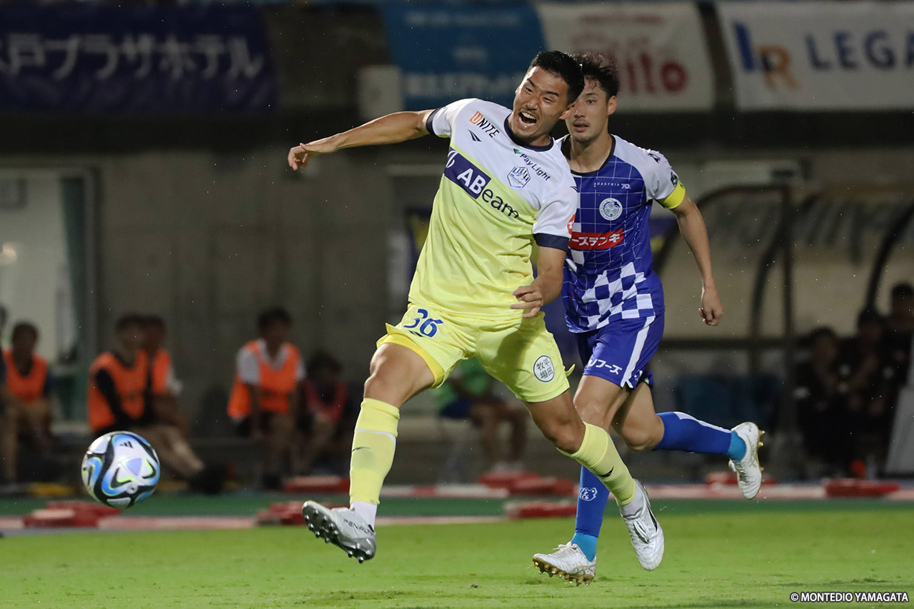 モンテディオは右サイドの川井が積極的に上がるなどリスクをかけながら水戸ゴールに迫るが、水戸は5バックに変更して守りを固めた。その中でモンテディオは89分にFK。何度かラフにボールを蹴り返したあと、密集の間にバウンドしたところを見逃がさず、高橋が潜り込んでシュートを放ったが、これはポストにはね返された。