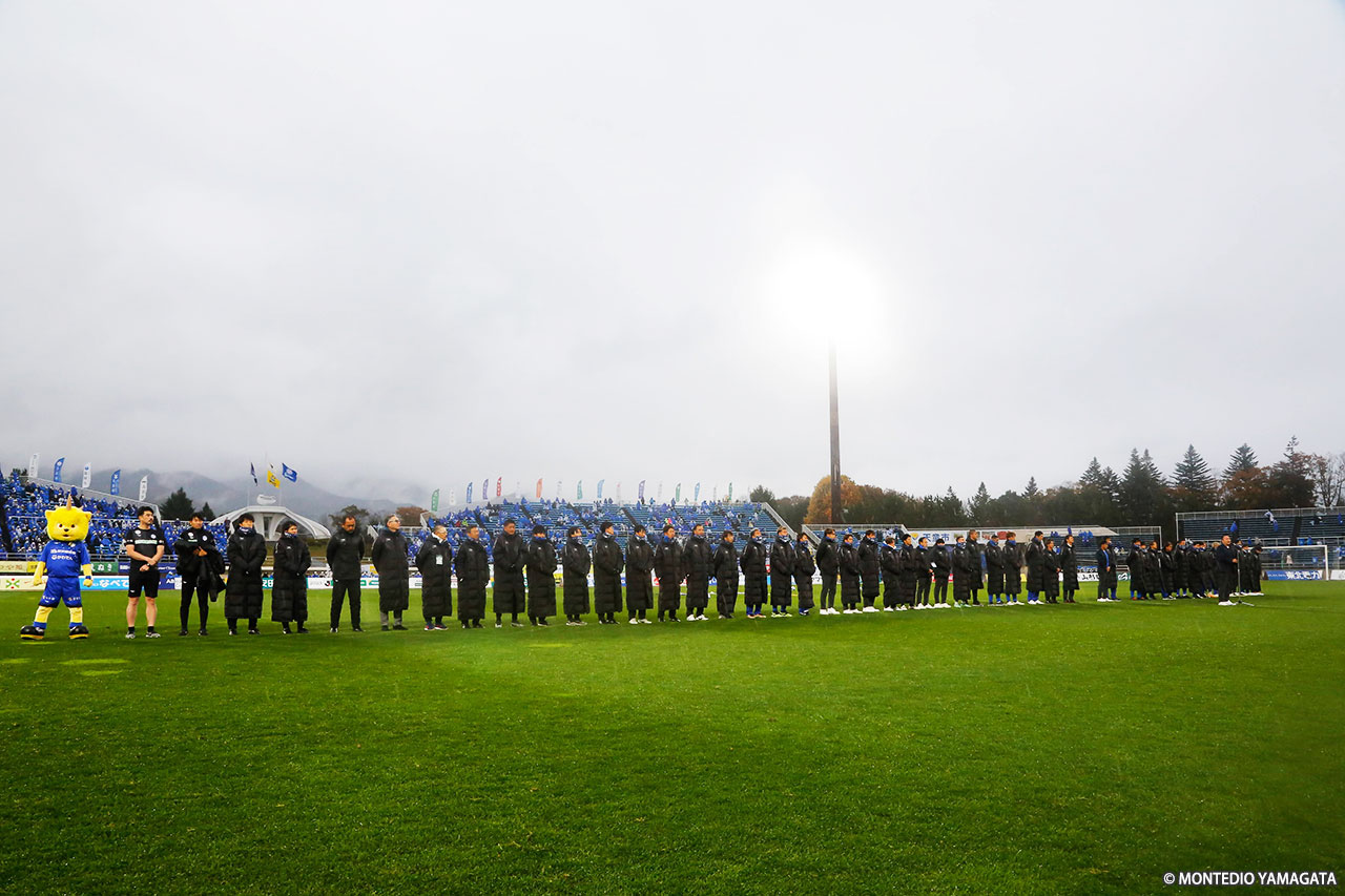 9戦負けなしの甲府に対して、4連勝中のモンテディオは勝てばプレーオフ決定、引き分け以下では進出できない条件。キックオフ直前の気温は7.8℃と低いなか、12,881人を集めたスタジアムで運命の一戦の火蓋が切られた。