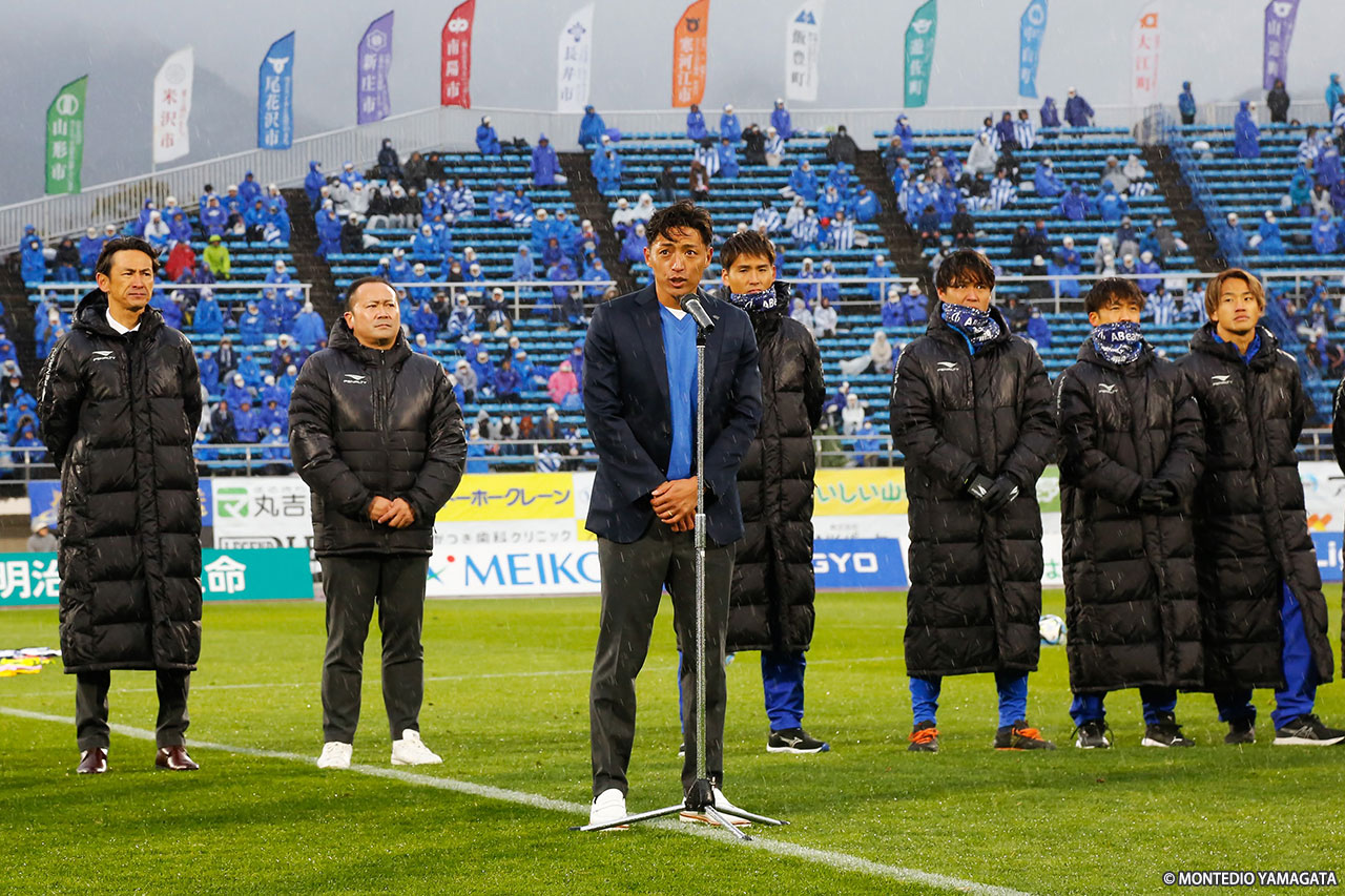 まずは冷たい雨のなか集まっていただいた12,000人を超えるサポーターの皆さんありがとうございました。それから、もしかしたら今日は雨予報だったので、行くのをやめようかなと思って、それでも中継先で思いを届けてくれたサポーターの皆さんありがとうございました。