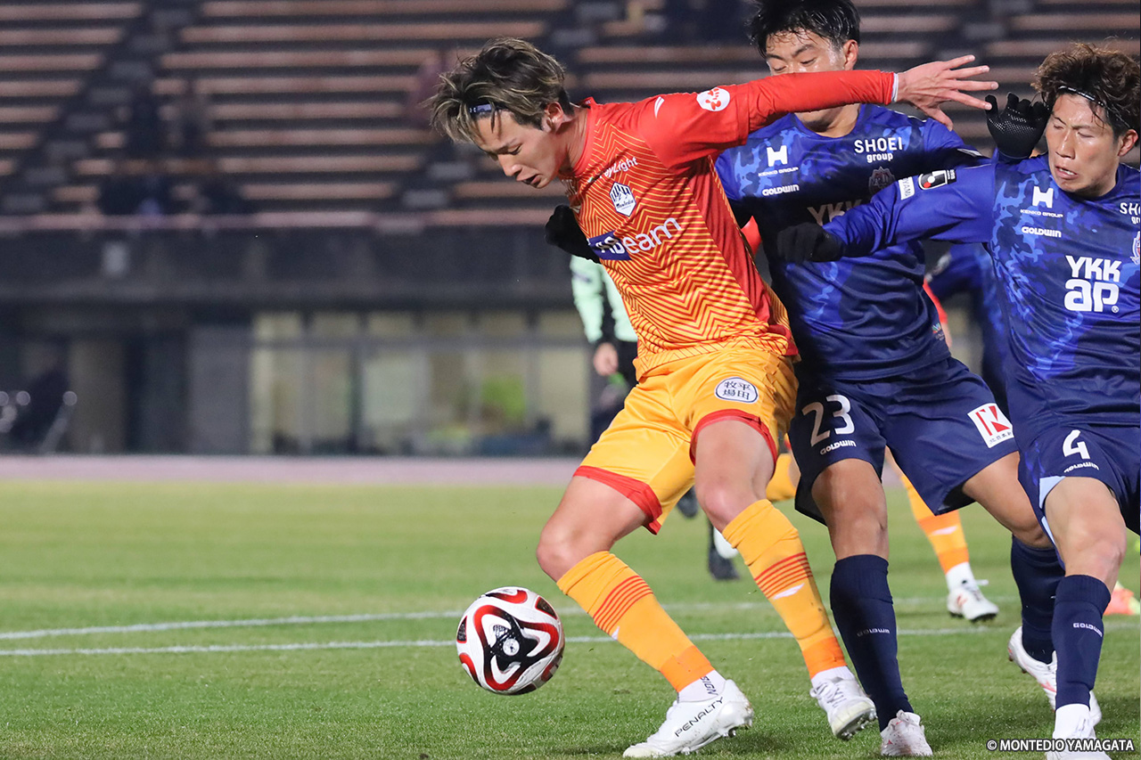 キックオフ直前の気温は2.9度。吐く息がはっきりと白く見えるほどの寒さとなったが、山形は立ち上がりからしっかりとボールを握り、相手のスペースに立ち位置を取りながら攻撃で圧倒する。