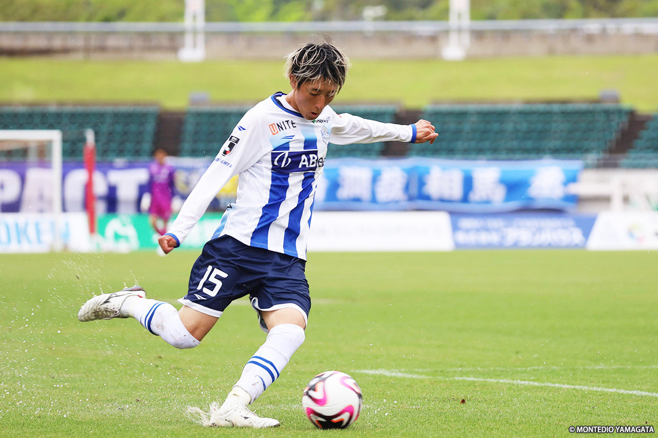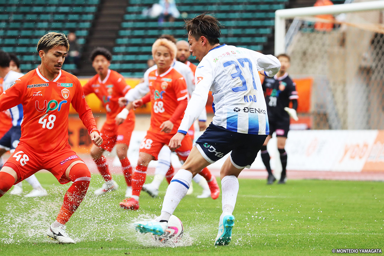 あいにくの雨、そしてピッチの所々に水溜まりという難しいコンディションの中で行われた一戦、立ち上がりは互いにシンプルにロングボールを前線へと供給し、チャンスを伺う。最初にチャンスを迎えたのは山形。13分、左に流れた南のクロスに杉山が頭で合わせたが、わずかに枠を外れた。その後、CKを複数獲得するも決定機には至らなかった。