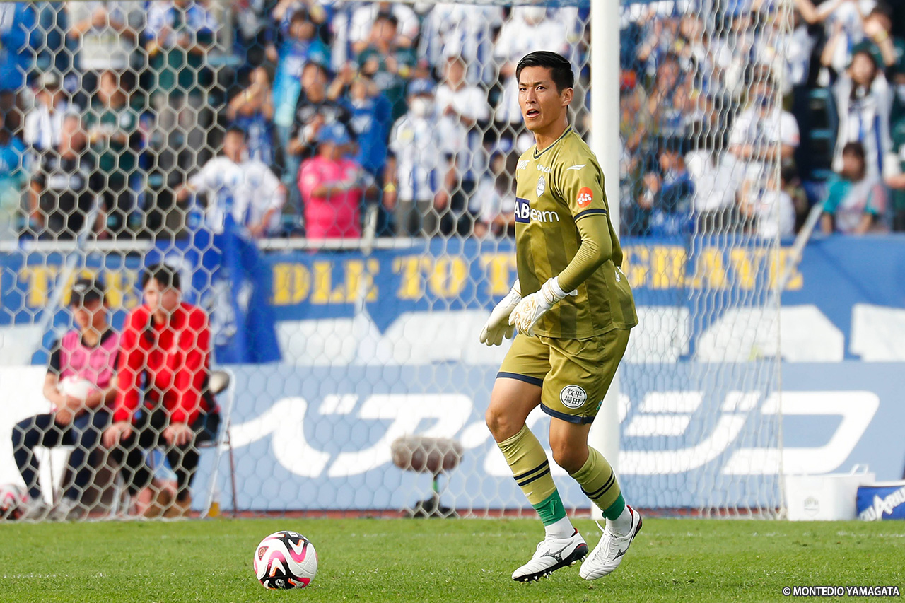 終盤、山形は前線へ効果的なパスを送れず、攻撃が停滞。再び我慢の時間帯となり、82分には大﨑にドリブル突破を許してゴール前に迫られ、最後は途中出場して間もない竹本雄飛にシュートを打たれたが後藤雅がファインセーブ、チームを救った。