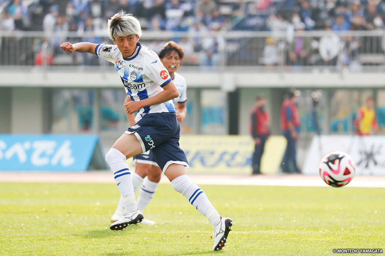 後半、最初にチャンスを迎えたのは山形。48分、相手のオフサイドでFKを獲得、髙江麗央の素早いリスタートを土居が受け、ワンタッチで小西へ。小西はディサロ燦シルヴァーノへ中央を割る縦パスを供給、これが通ってフィニッシュまで運んだが、相手DFのブロックに阻まれる。その2分後には、小西が高い位置でボールを奪った流れからFKを獲得。キッカーの髙江がワンステップで入れたクロスを安部崇士が頭で合わせたが、田代に防がれた。