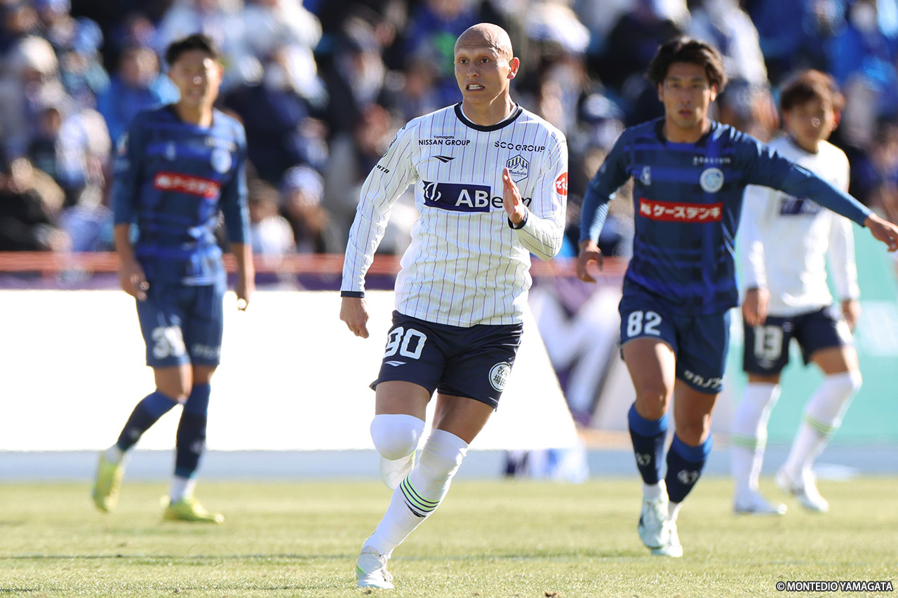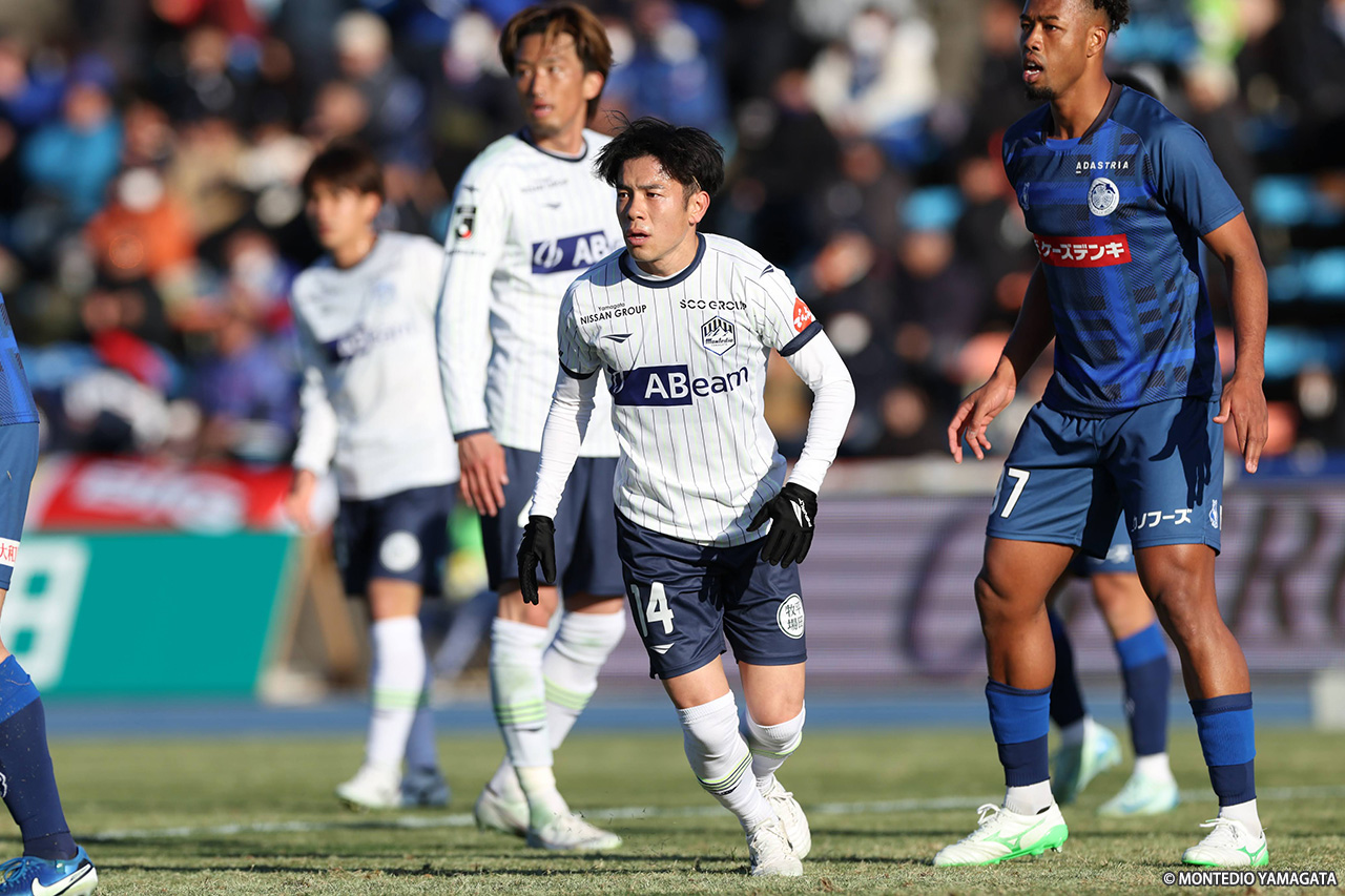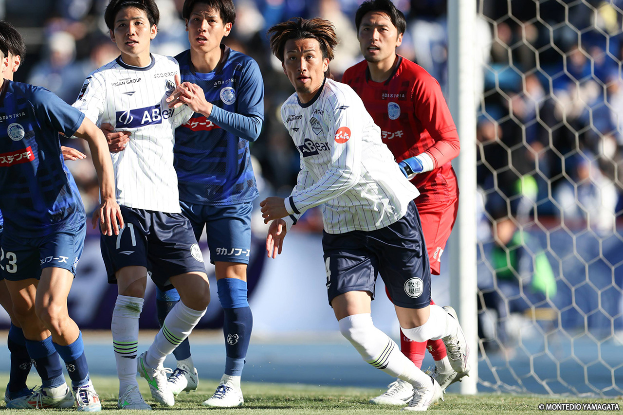 最終盤に入り87分、山形は背後を取る攻撃からチャンスを演出。野嶽寛也のクロスをきっかけに中村亮太朗、高橋が立て続けにシュートを放ったが、相手の決死のブロックに阻まれてゴールを割ることが出来ない。その後、山形はロングボールやクロスを再三供給してパワープレーを仕掛けるが、水戸は最終ラインを1枚増やし、5バックで対応。この粘り強い守備を前に最後までゴールをこじ開けられなかった。