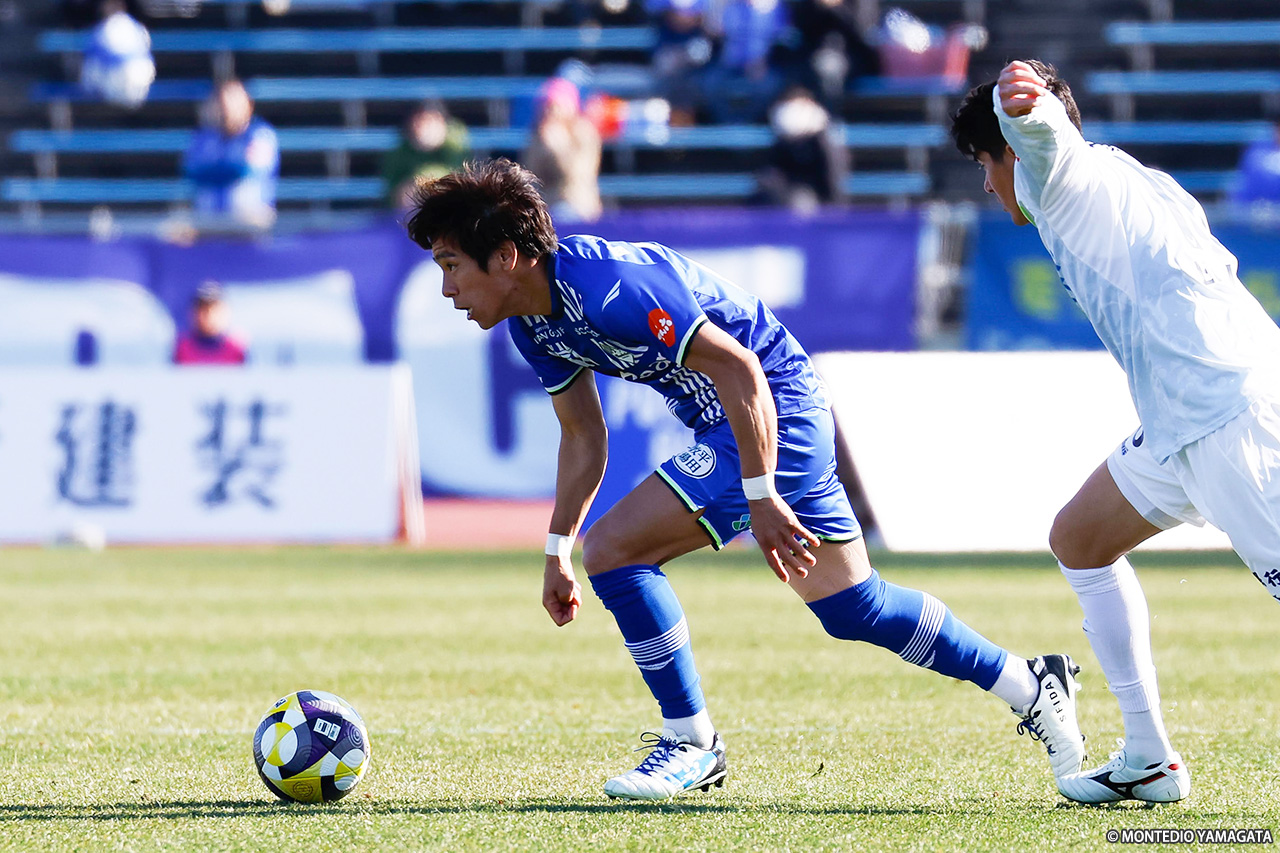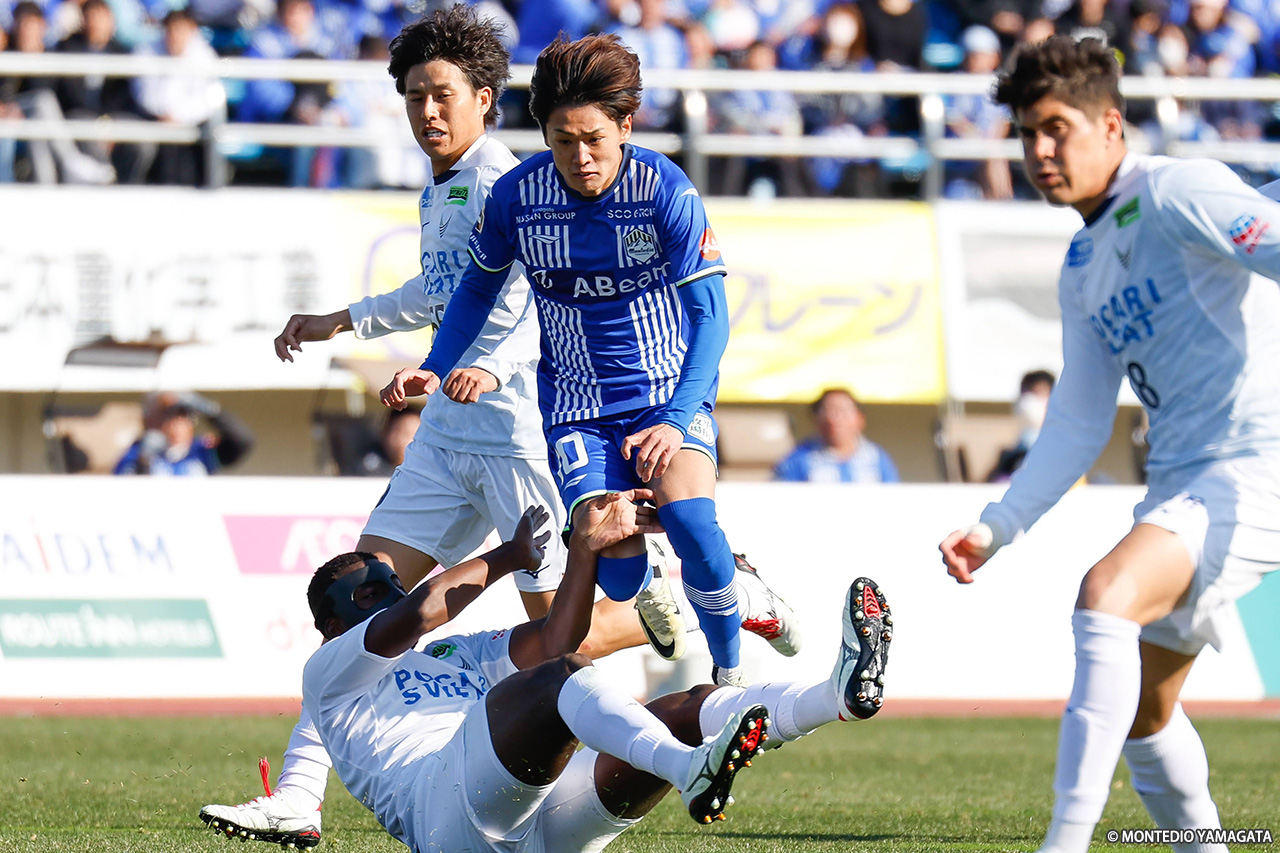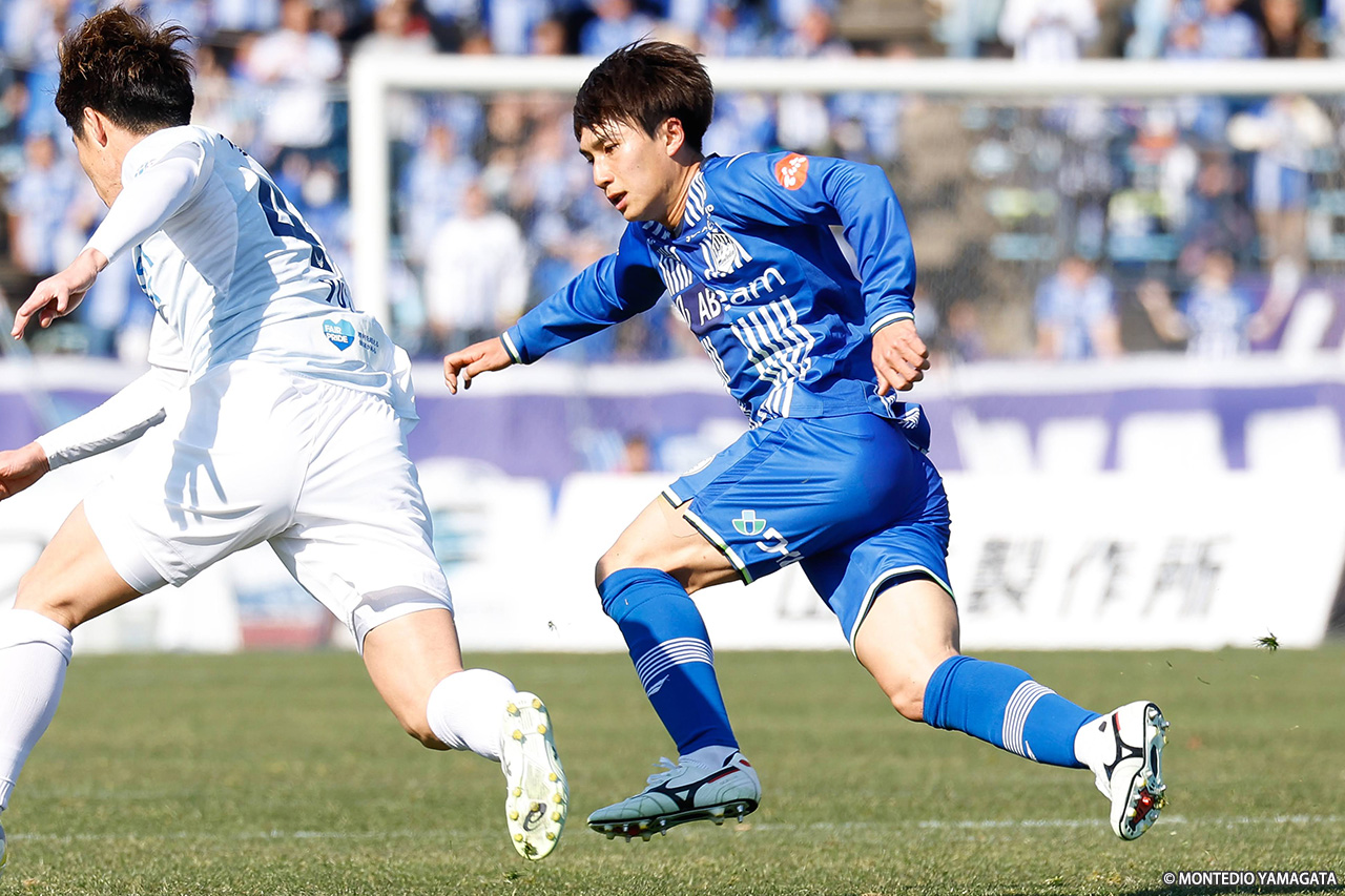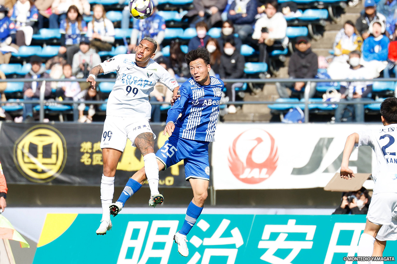 形勢逆転を許すも耐えた山形は前半終了間際、田中渉のサイドチェンジを氣田が受けてクロス。堀金が下がりながらヘディングで合わせたが枠を捉えられず、直後に前半終了の笛が吹かれた。