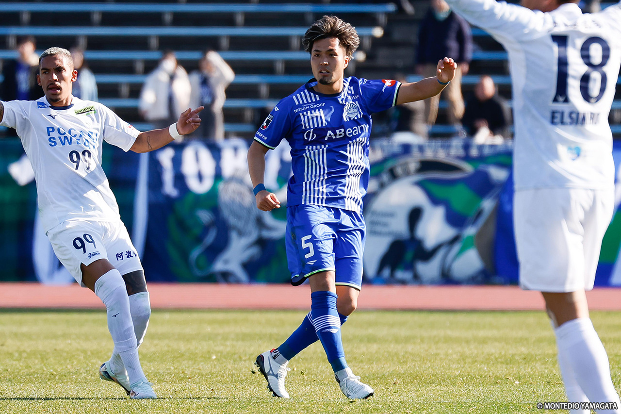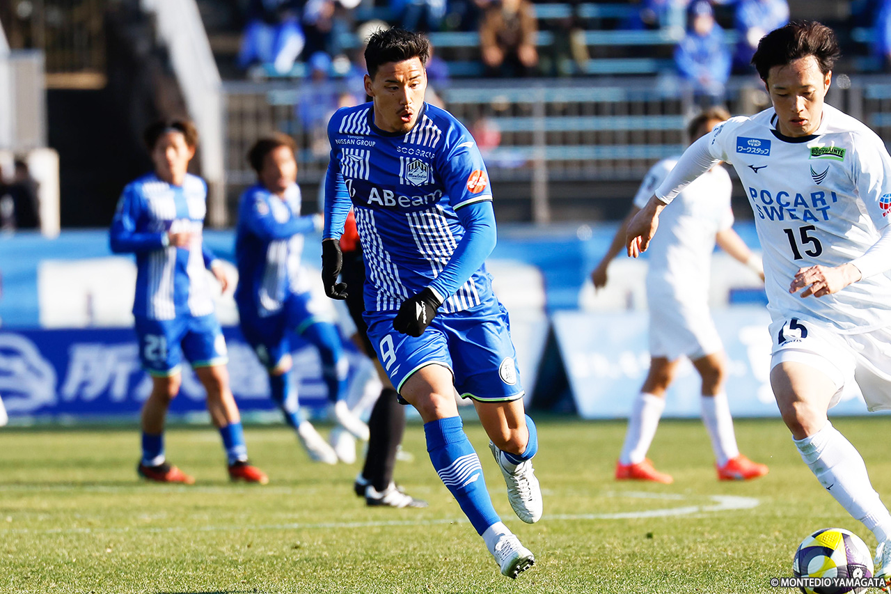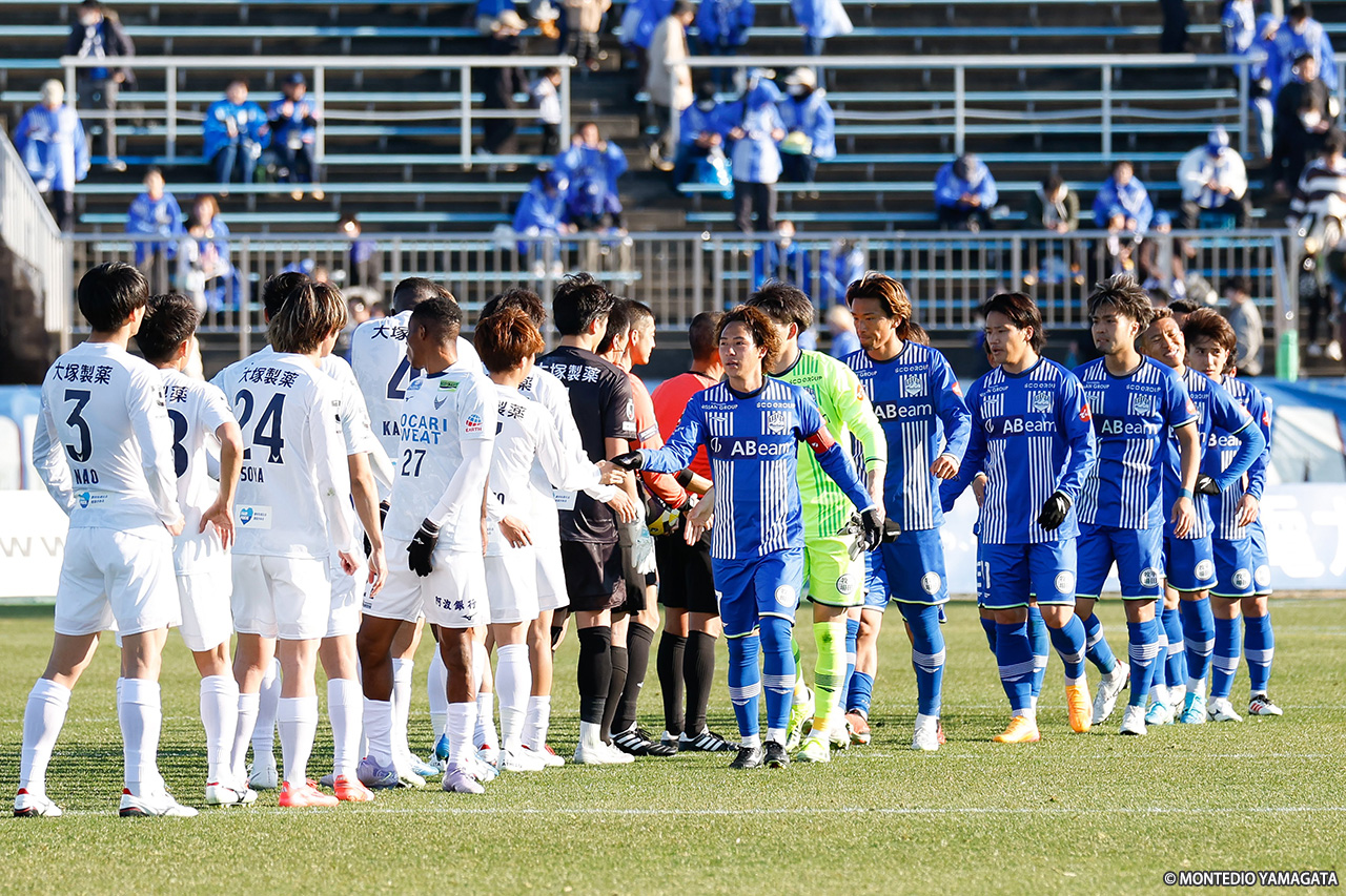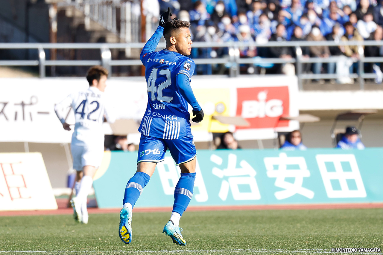 形勢逆転を許すも耐えた山形は前半終了間際、田中渉のサイドチェンジを氣田が受けてクロス。堀金が下がりながらヘディングで合わせたが枠を捉えられず、直後に前半終了の笛が吹かれた。