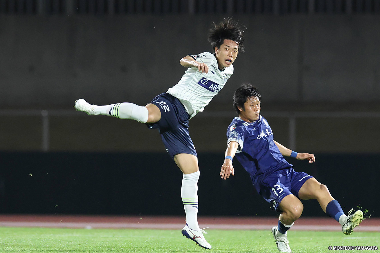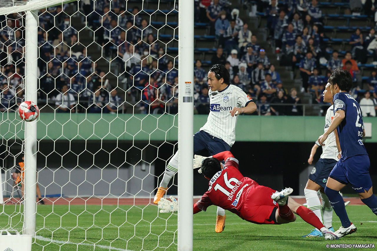 しかし、直後に山形も反撃。中央をドリブルで持ち運んだ藤本がシュートを狙う。ここは戻った藤村慶太に止められたが、直後のCKの流れから、坂本の山なりのクロスをワンバウンドで受けた加藤がワントラップから右足を振った。しかし、ここはGK山内康太が伸ばした左手に当てたことで、枠には当たったがゴールとはならなかった。直後のCKでもイサカのヘディングが防がれた。59分には右サイドで背後を取ったイサカがドリブルから切り返し、左足を振ったが、