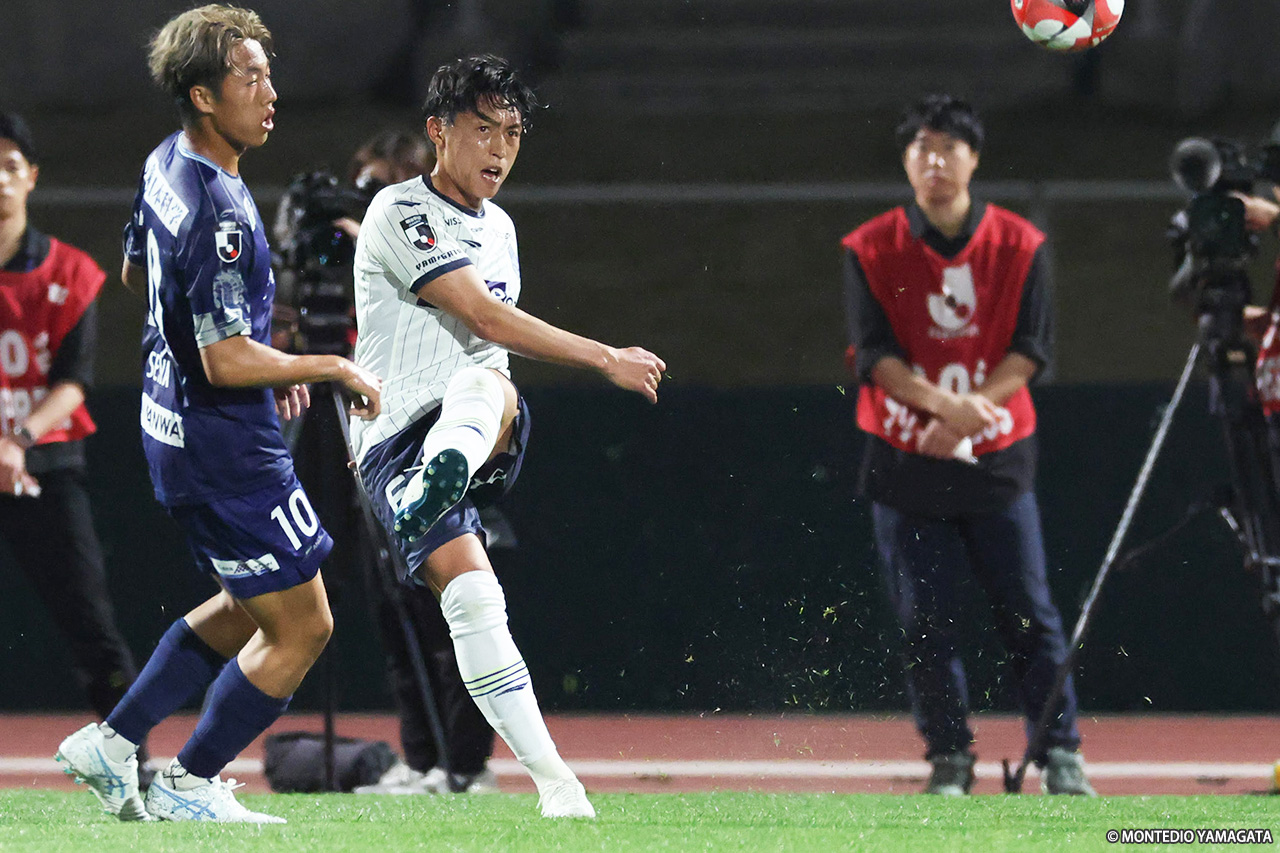 山形はビルドアップに硬さと消極性があり、相手の2トップの前でボールを動かす時間が長かったが、13分頃からは坂本亘基から川井歩へ、城和隼颯からイサカゼインへと大きいサイドチェンジが出るようになり、徐々に押し込むと右からのCKを獲得。15分、キッカー・吉尾海夏がマイナス気味に蹴ったインスイングのボールをフリーの坂本がシュート。GKが弾いたボールをイサカが収め切れなかったが、こぼれ球を藤本佳希が押し込み、山形が先制した。