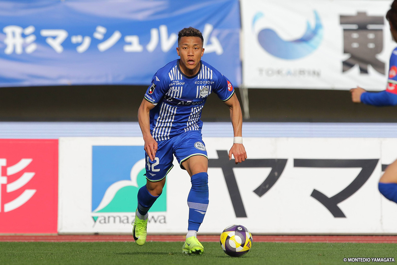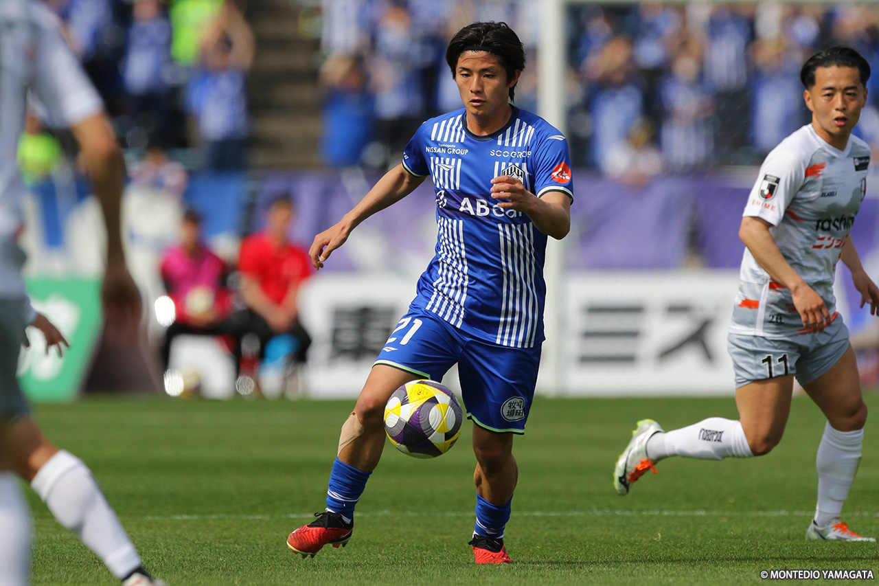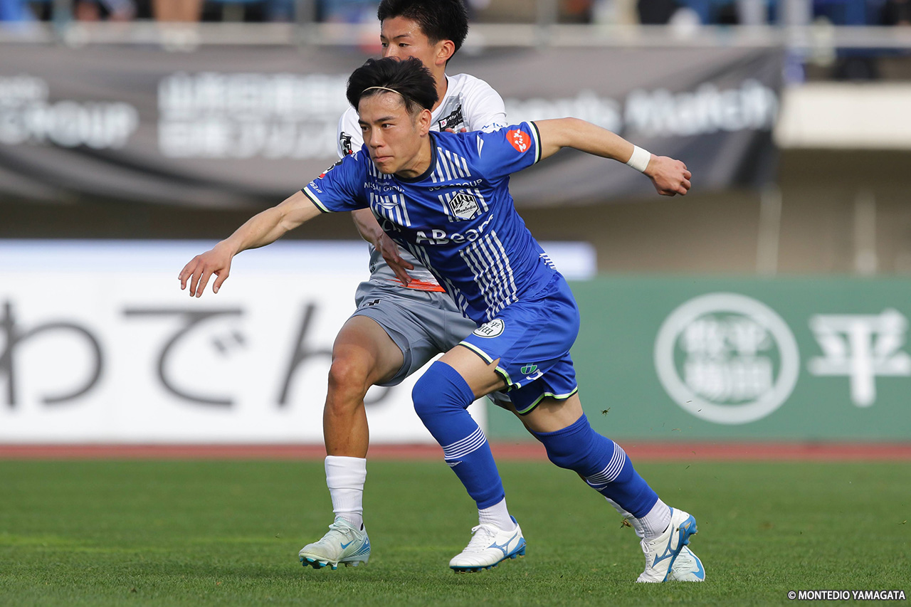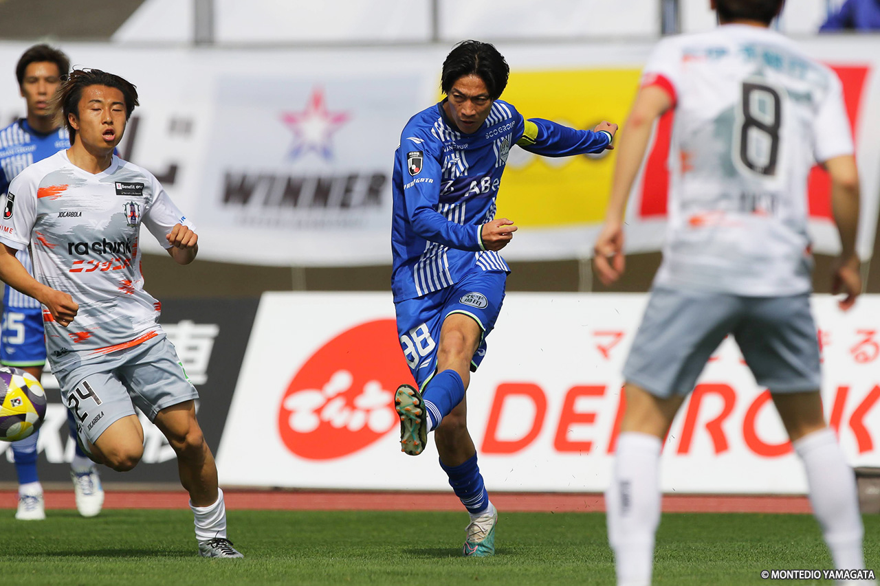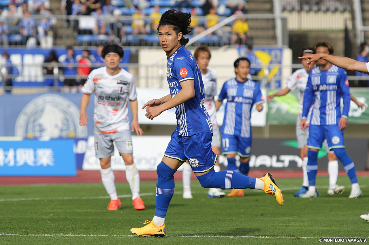 前半の終盤、山形は中央突破から好機を演出し42分、髙江が田中とのパス交換からボールを運び、中央を割るパスを入れるも、ディサロ燦シルヴァーノには通らず。その2分後には、田中がコントロールショットを放ったが、GK・辻の好セーブに阻まれた。