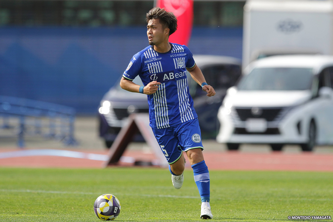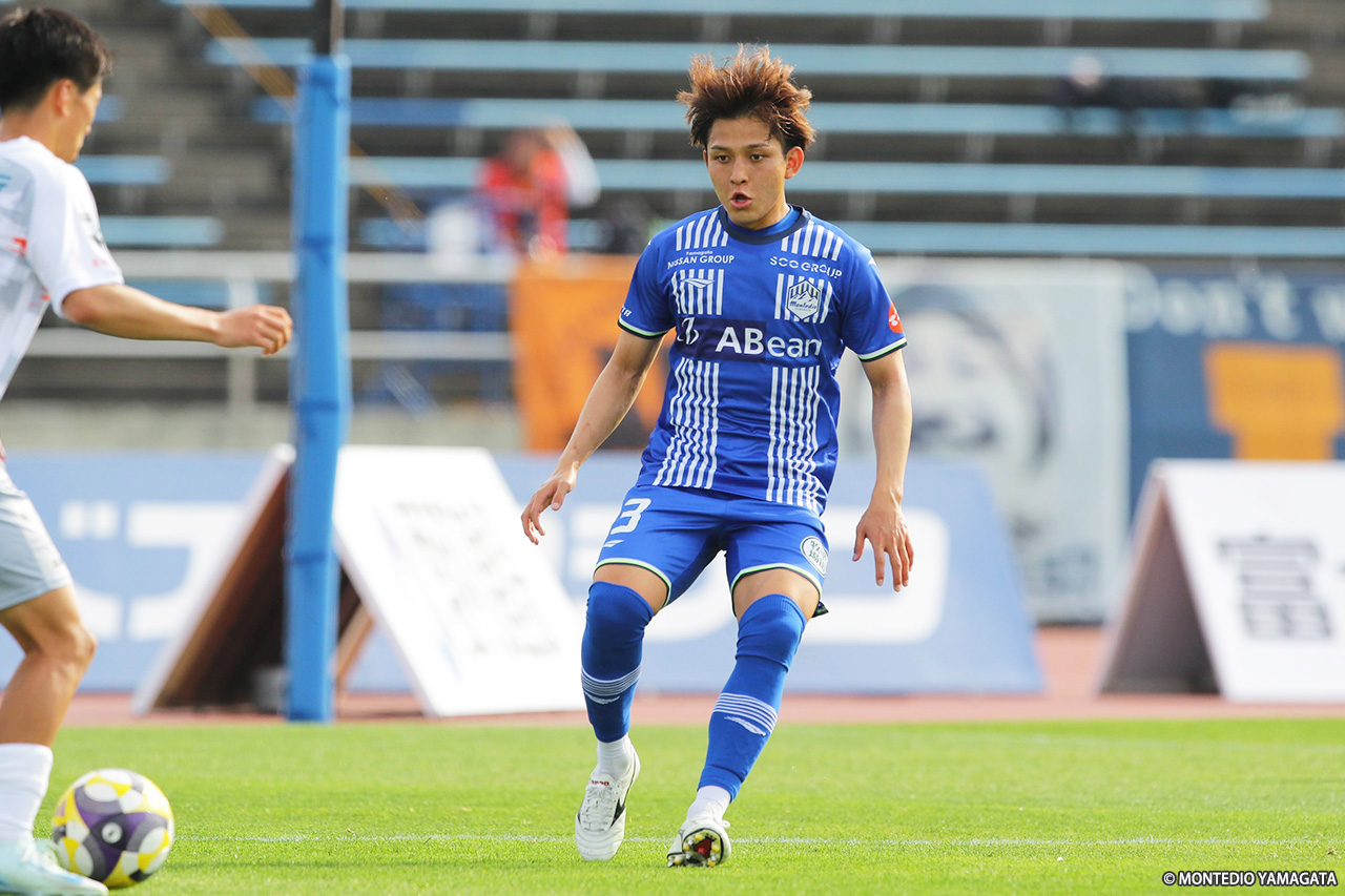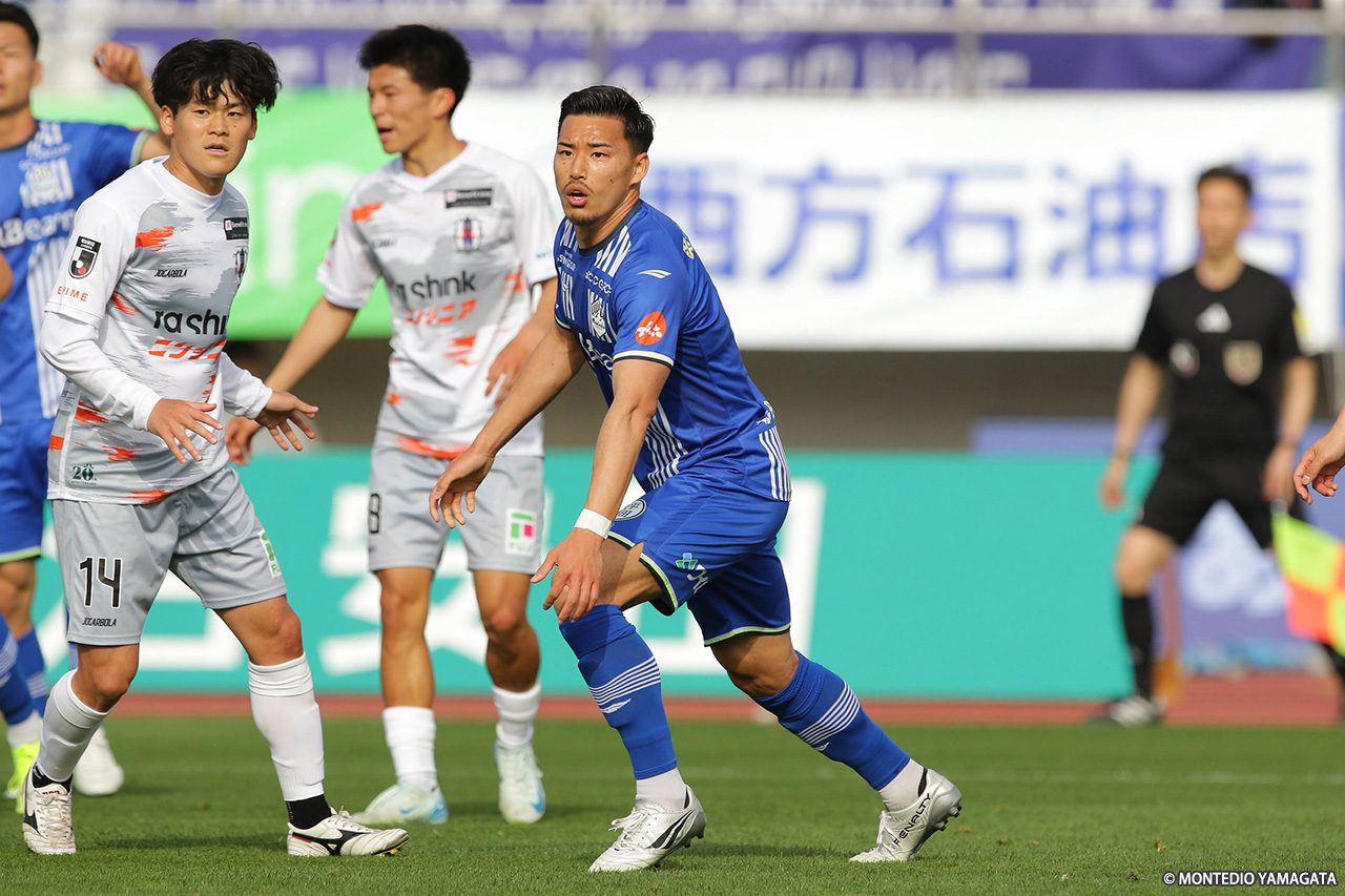 試合前の気温が23.5℃とこの時期にしては高温のコンディションで行われた一戦。開始間もなくは、ボールが落ち着かない展開だったが、徐々に山形がマイボールとする時間が増え、細かいパスワークでゴール前に迫る。4分、野嶽寛也のクロスが相手GKに弾かれ、そのこぼれに氣田が反応してシュート。その2分後には右CKを獲得し、キッカーの田中渉が変化をつけたクロスを供給、髙江麗央が合わせたが、いずれも枠を捉えられなかった。