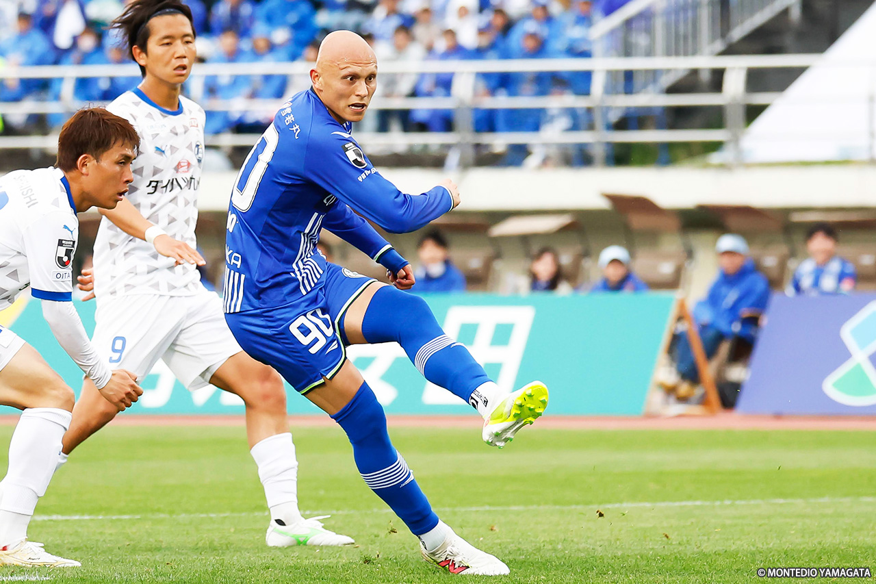 5試合ぶりの先制点を挙げた山形は33分にも、J2通算200試合出場を達成した髙江麗央からのロングボールを裏抜けした藤本が収めて右へ。ボールを受けた吉尾のクロスがディサロ燦シルヴァーノへ渡り、決定機を迎えたが、トラップからのシュートは枠を捉えられなかった。