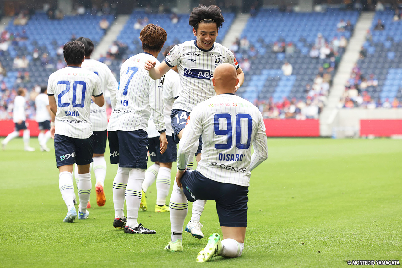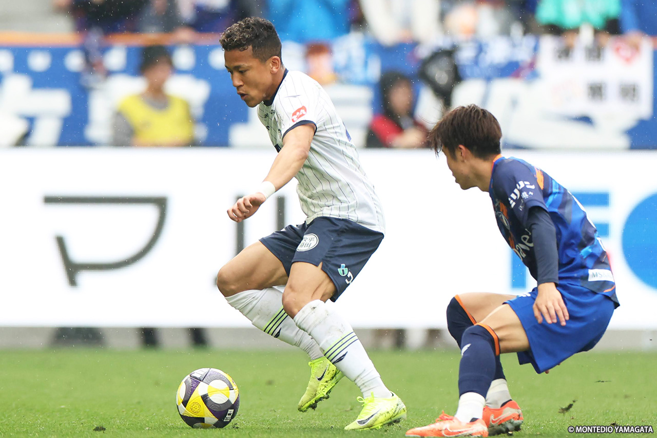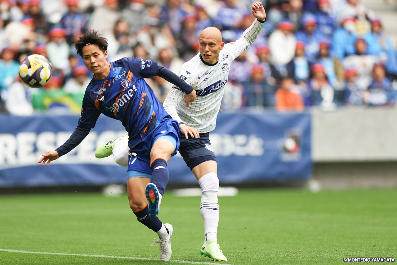 70分、山形は先制点をマークしたディサロに代えて高橋潤哉、藤本佳希に代えて堀金峻明を投入する。その直後、マテウスのミドルレンジから狙い澄ましたシュートがクロスバーに直撃し、山形はヒヤリとした。