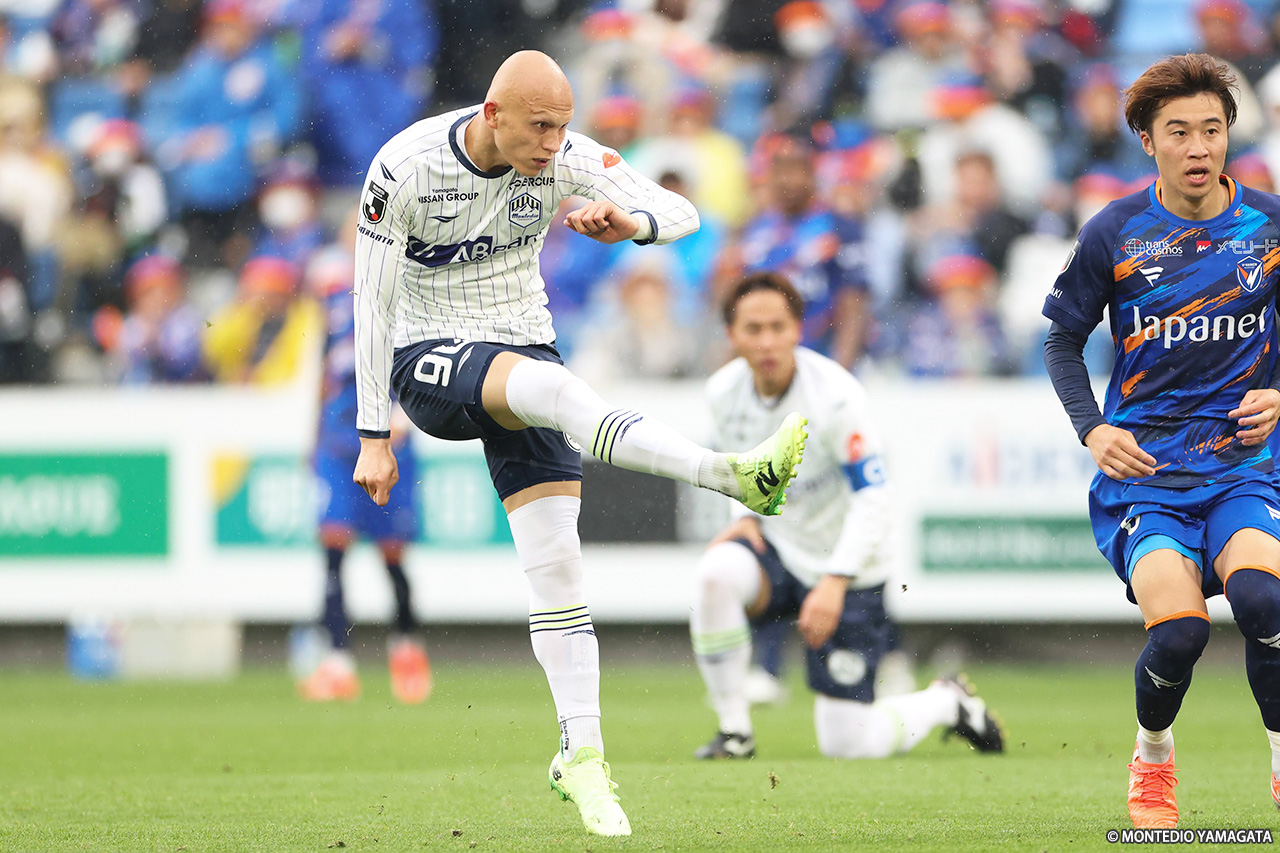 小雨が降る中、13,044人の観客が詰めかけたゲームは開始早々に動いた。3分、熊本雄太からの対角線のサイドチェンジを坂本が収めてクロス。これをディサロ燦シルヴァーノが左足で合わせるとゴール左隅に決まり、山形が先制に成功した。