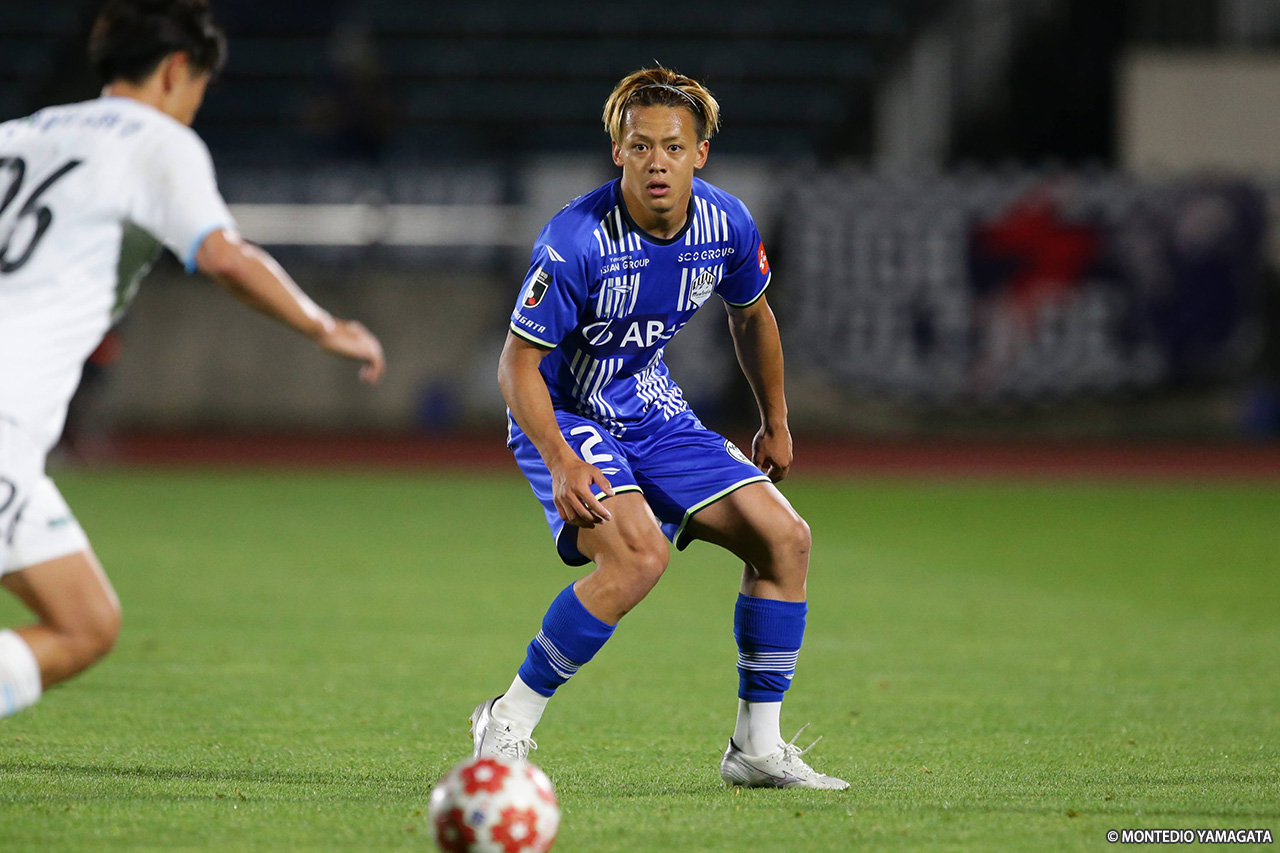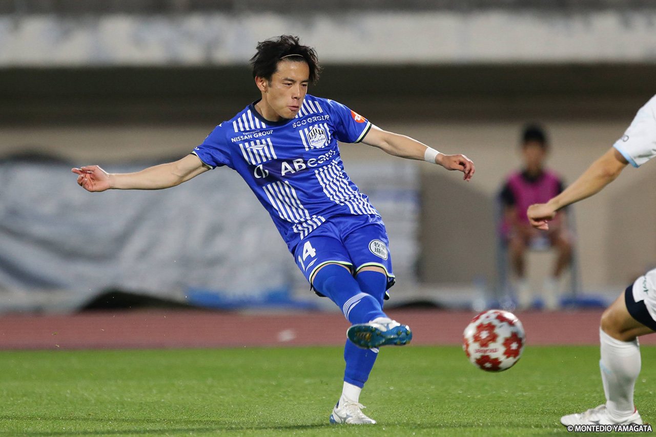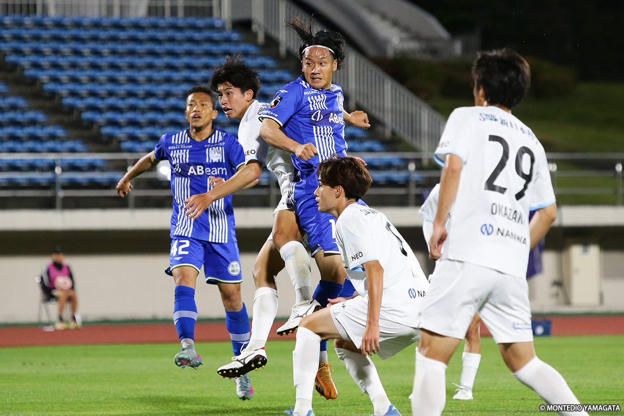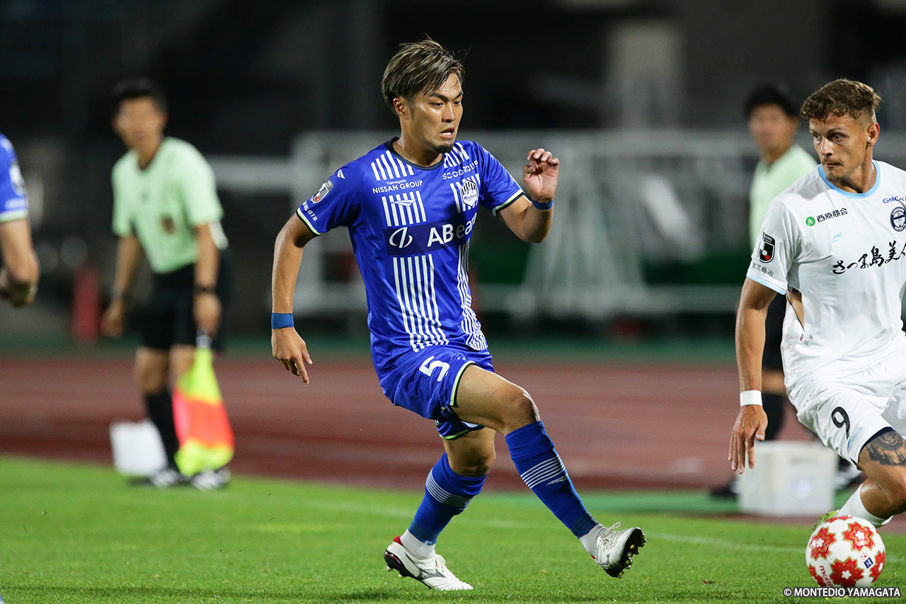 互いにシンプルに相手陣地にボールを送り合う立ち上がりを経て、先にチャンスをつかんだのは山形。2〜3分のFK、CKは活かせなかったが、4分、中村亮太朗の右からのクロスを、ファーサイドで収めた坂本亘基が落ち着いて枠内に流し込み、山形が先制した。