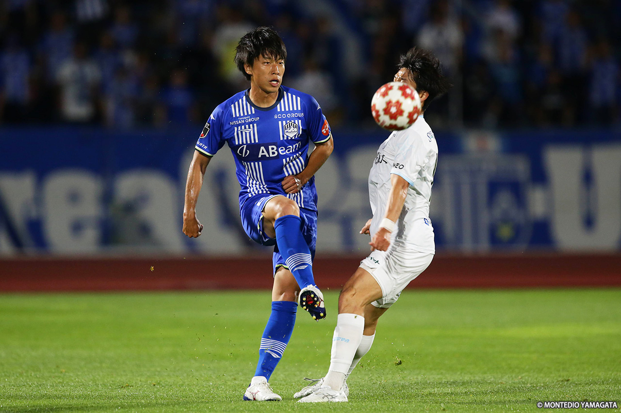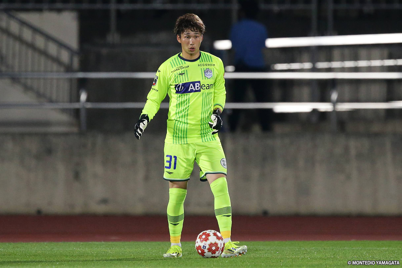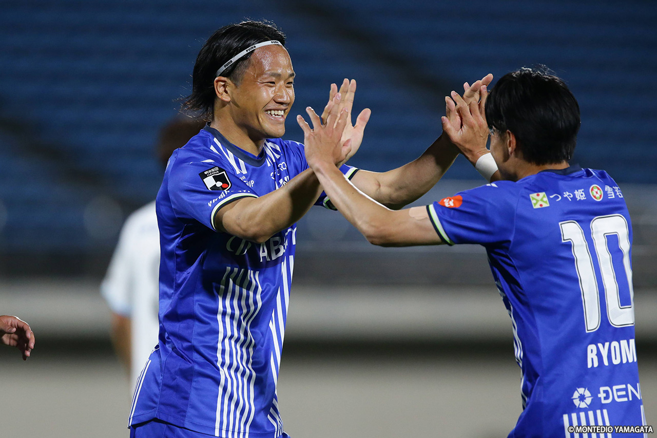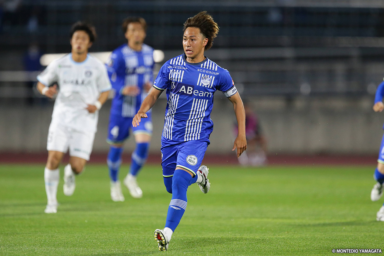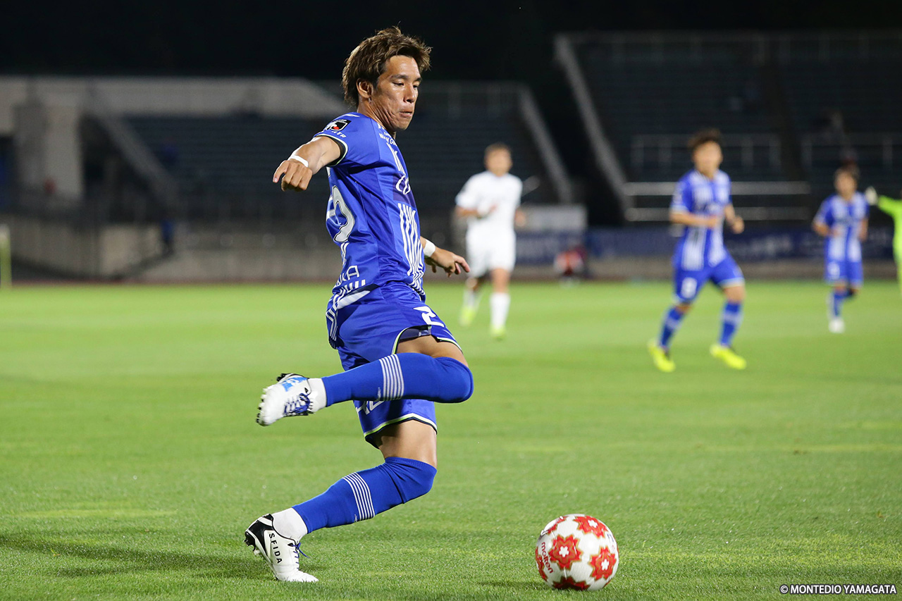 互いにシンプルに相手陣地にボールを送り合う立ち上がりを経て、先にチャンスをつかんだのは山形。2〜3分のFK、CKは活かせなかったが、4分、中村亮太朗の右からのクロスを、ファーサイドで収めた坂本亘基が落ち着いて枠内に流し込み、山形が先制した。
