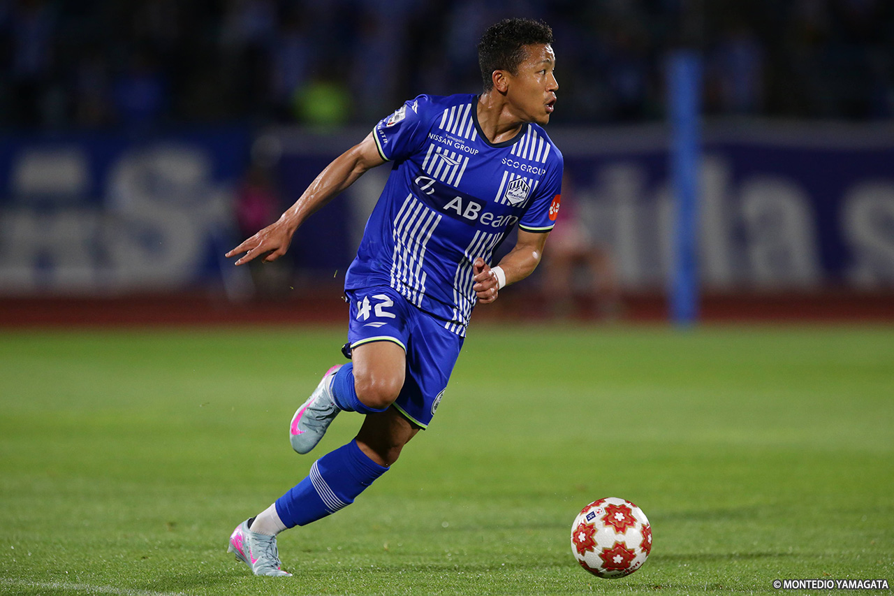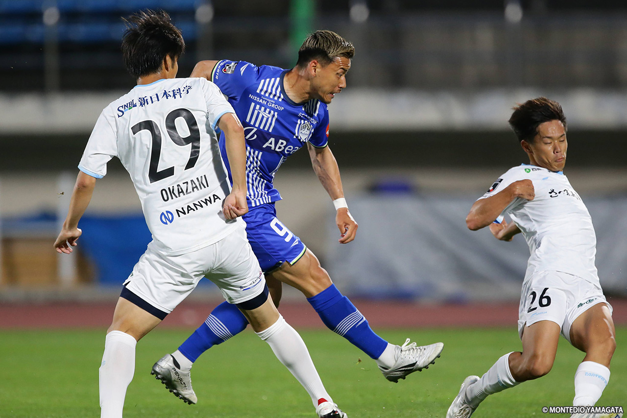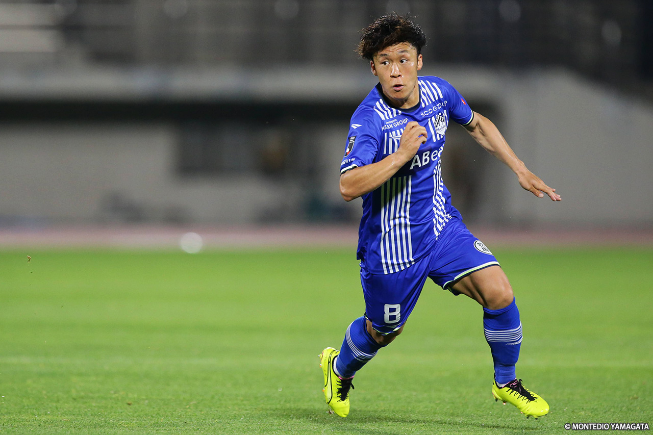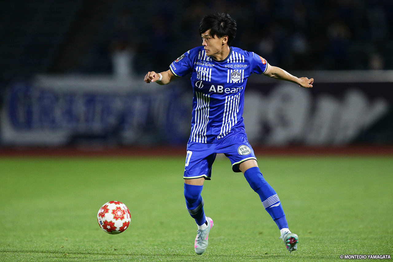 互いにシンプルに相手陣地にボールを送り合う立ち上がりを経て、先にチャンスをつかんだのは山形。2〜3分のFK、CKは活かせなかったが、4分、中村亮太朗の右からのクロスを、ファーサイドで収めた坂本亘基が落ち着いて枠内に流し込み、山形が先制した。