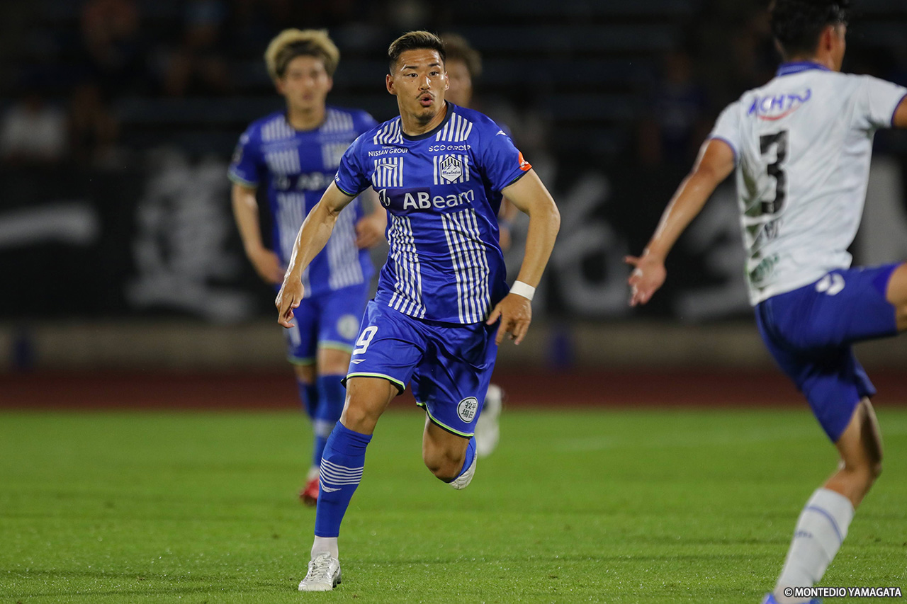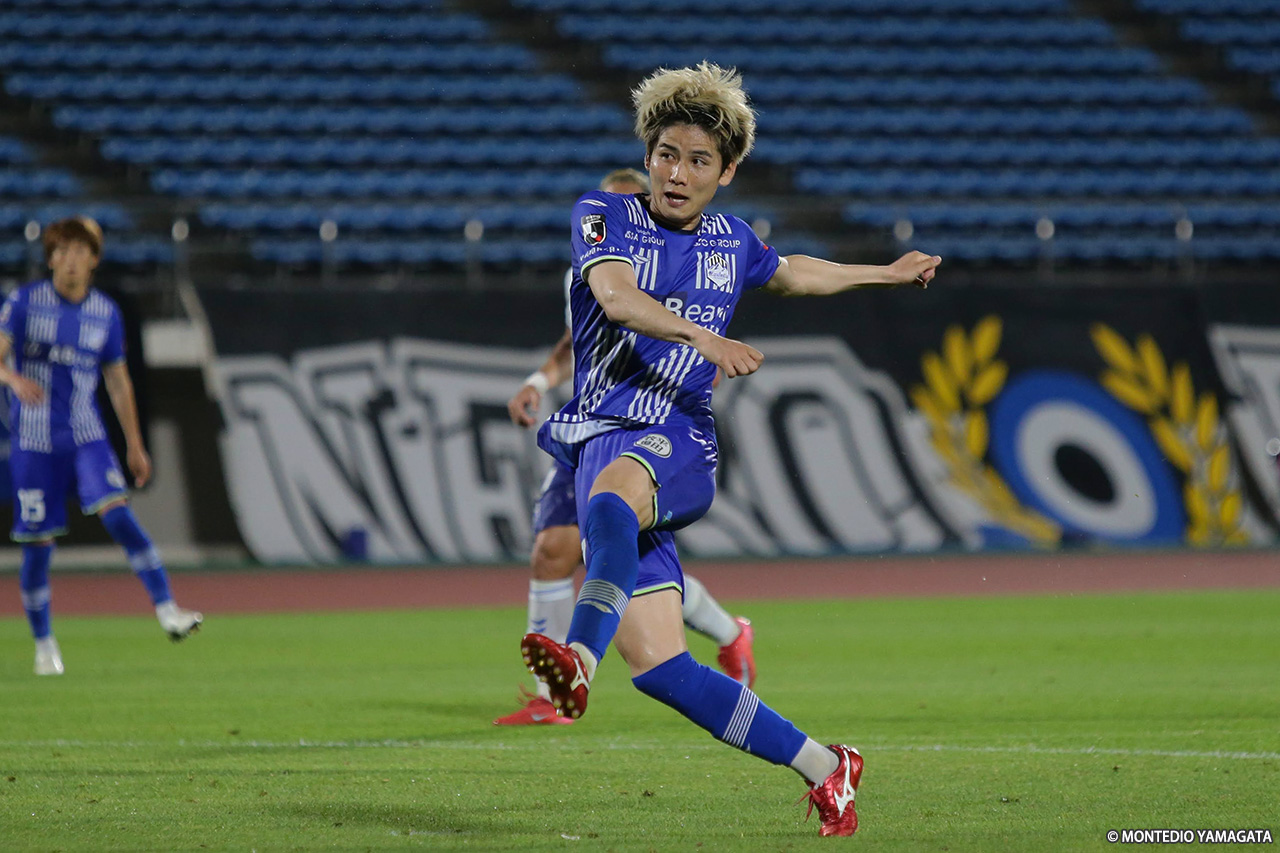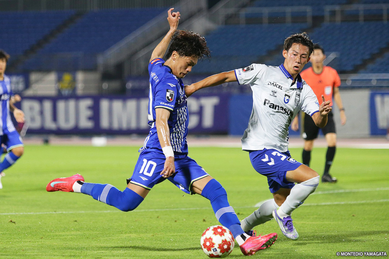 山形に先制点が生まれたのは20分。川井歩のパスを受けた氣田が仕掛け、2度切り返したあと右足を振り抜くと、ファーサイドのポストに当たったシュートはそのままゴールに吸い込まれた。これでG大阪も少しテンポを上げてきたが、30分、川井のワンタッチの浮き球を受けた氣田が振り向き、ミドルレンジから放ったシュートが決まり、山形が2-0とリードを広げた。