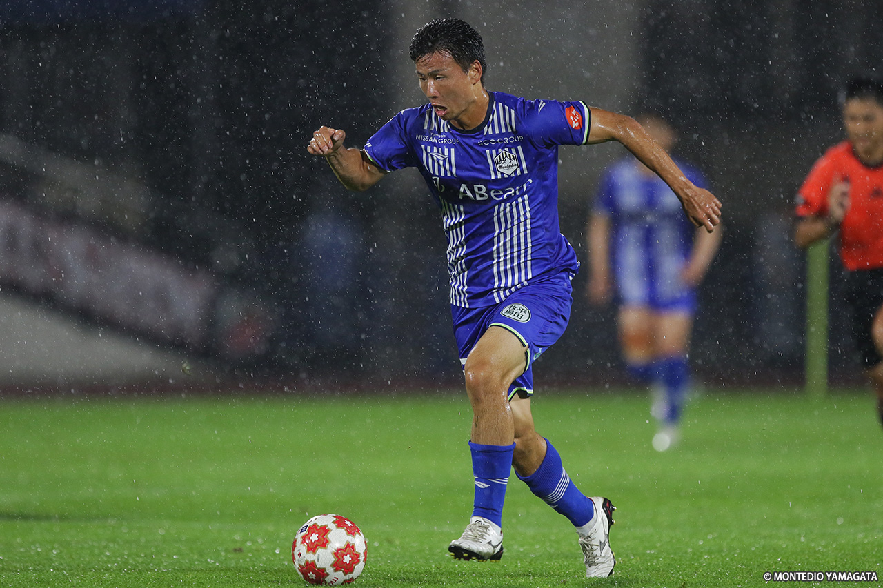 開始前から激しいあめが降り続いたこともあり、ピッチには水がたまり、減速したボールはぴたりと止まるようなピッチコンディションとなった。その中で、山形は立ち上がりに見せる。