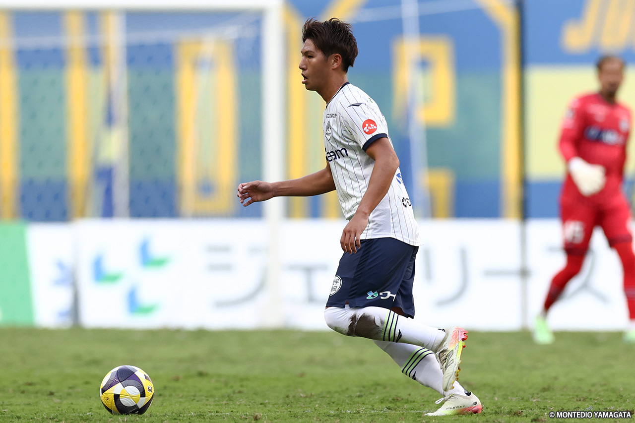 45分、中村亮太朗が奪い返したボールを氣田亮真が収めると相手に倒され、山形はFKを獲得。すると久しぶりに訪れたこの好機を得点に結びつける。45分+1、キッカー・野嶽寛也のクロスはクリアされたが、セカンドボールを岡本一真が回収し右へ。受けた氣田がアーリークロスを入れるとディサロ燦シルヴァーノが胸トラップからシュート。ここは大分GK・ムン キョンゴンに弾かれたが、こぼれ球を寺山翼が蹴り込んでネットを揺らし、移籍後初ゴールを挙げた。前半はこのまま終了、少ないチャンスをモノにした山形が2点をリードして試合を折り返した。