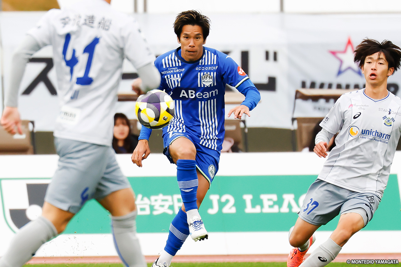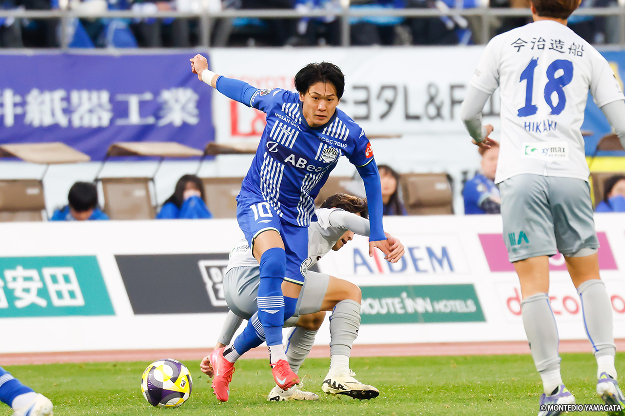 11月初戦の前節、3試合ぶりの白星を挙げた11位・モンテディオ山形はホーム・NDスタに帰還し、10位・FC今治と対戦。キックオフ前の気温が11.7℃と冷え込むコンディション下で行われた一戦は、劣勢が長く続きながらも数少ないチャンスで2得点を挙げた山形が勝利した。
