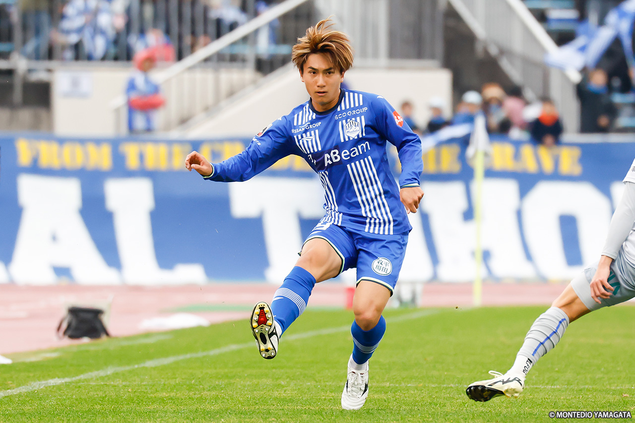 すると79分、西村から縦に送られたボールを、國分がワンタッチで中央の土居聖真へと繋ぎ、土居は右に展開する。パスを受けた氣田亮真がカットインから放ったシュートは相手のブロックに遭ったが、それによって浮いたボールに寺山が反応。豪快に放ったボレーシュートはゴール左隅に決まり、山形が勝ち越しに成功した。
