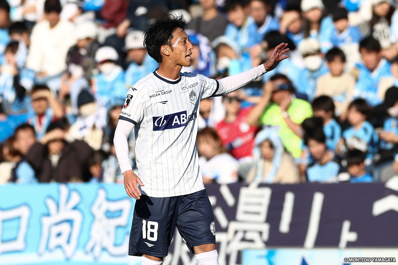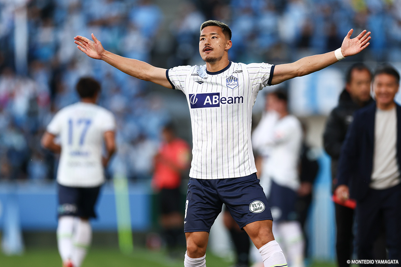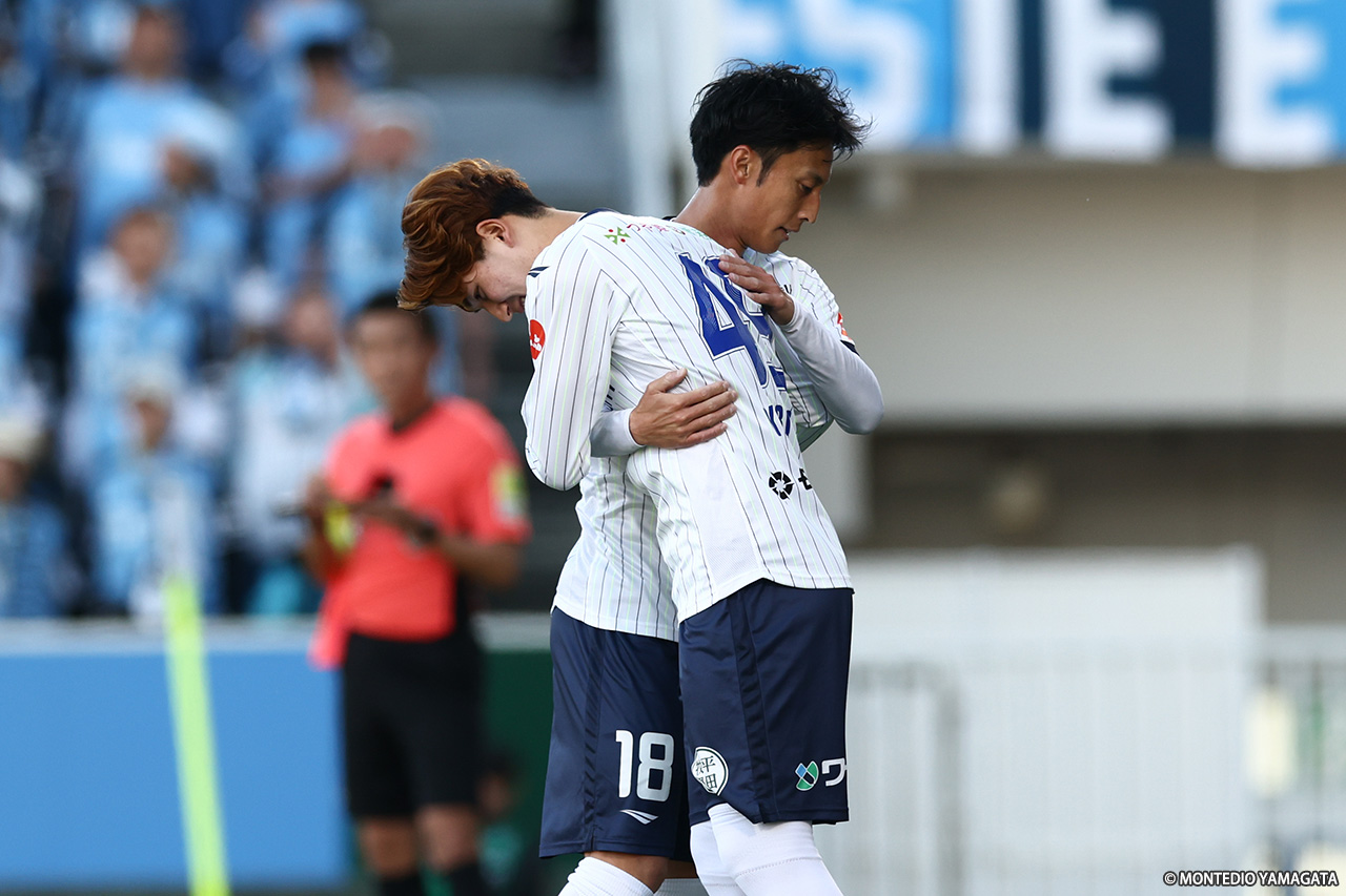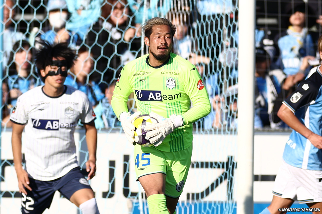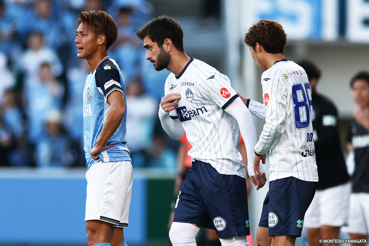 再三送られるロングボールやクロスを城和や西村慧祐を中心に跳ね返し、今季初の3連勝が近づいてきた山形。しかし90分+6、角のクロスをファーサイドで待ち構えていたファンデンベルフに高打点のヘディングで叩き込まれ、今期繰り返されていた終了間際の失点を喫した。同点とされた直後、角の横パスを受けた松原后に切り返しからのシュートを許したが、渋谷がキャッチしてタイムアップ。負けなしは7試合に伸ばしたが、悔しい引き分けに終わった。