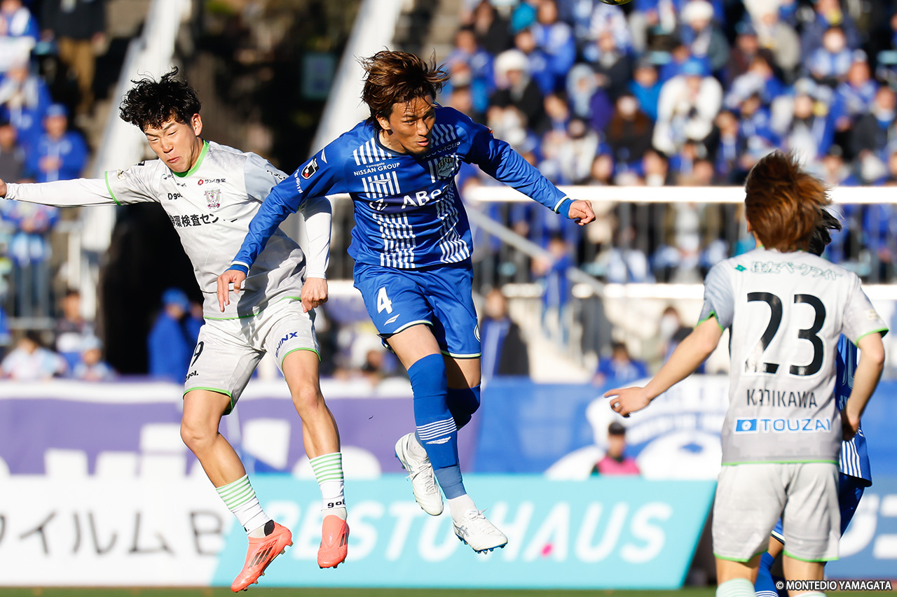 快晴が広がるも、冷たい風が吹くコンディション下で行われたゲーム。立ち上がりは山形が、相手のビルドアップを高い位置で奪って押し込み、岡本一真や氣田亮真が、エリア外から積極的にゴールを狙った。すると9分、相手のビルドアップのパスミスを寺山翼が逃さず奪い、右足で狙ったシュートがゴール右隅に吸い込まれた。これで7試合連続の先制成功となった。