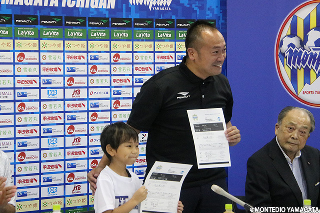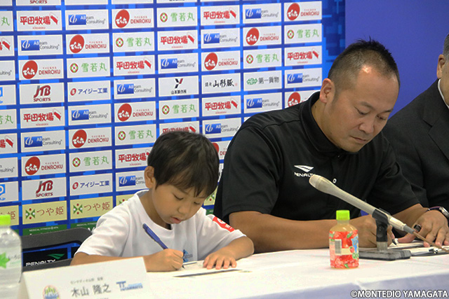 参画決定を受け、2019年9月4日、NDソフトスタジアム山形にてチームに入団する東根市の小学校1年生の富樫 陽向選手の記者会見を行いました。