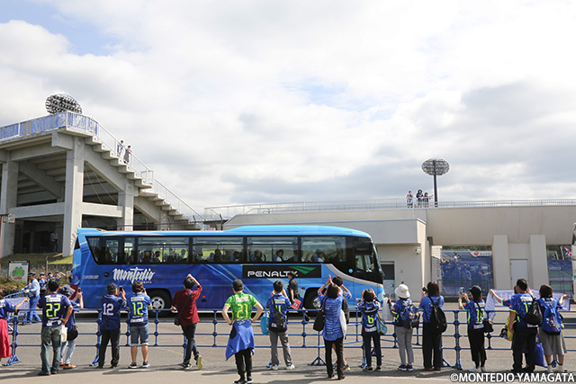 スタジアムに到着した選手たちを迎えるサポーターの皆さん。いつも温かい声援で選手たちを迎えて頂いてますが、この試合では先日お披露目されたあおぞら観光バス様によるモンテディオ山形ラッピングバスが初お目見え。大きな注目を集めていました。