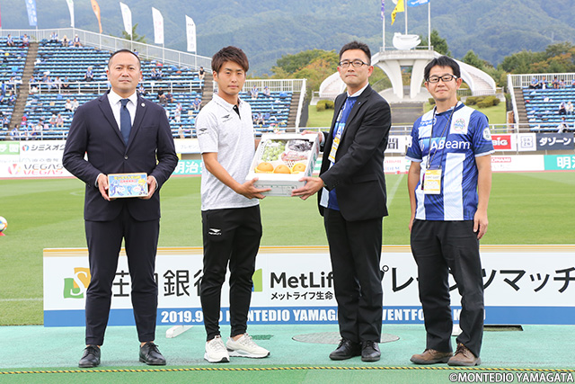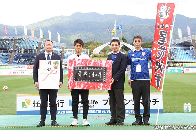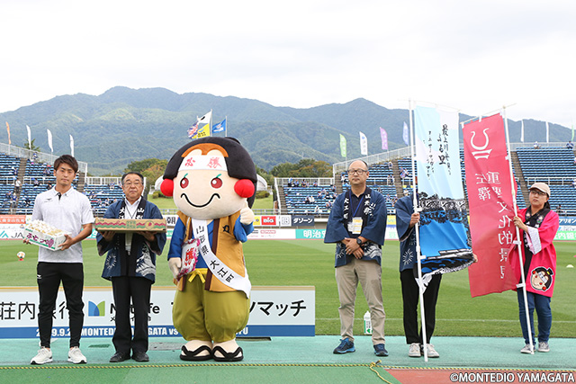 この試合は「尾花沢市・大江町・大石田町・鶴岡市」の市町村応援デーとして開催。たくさんの市民・町民の方にスタジアムにご来場頂いた他、チームへの贈呈品を頂戴しました。