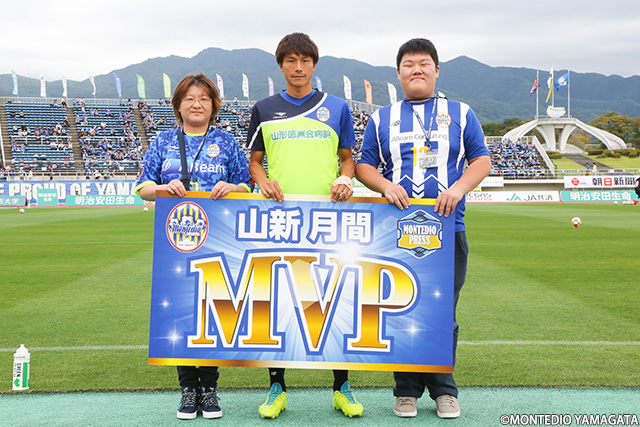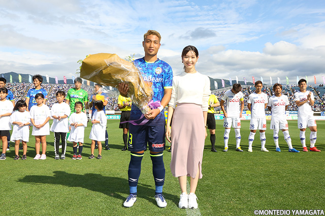 ピッチ内ウォーミングアップ前、8月の山新月間MVP賞の表彰が行われました。選ばれたのは怪我から復帰し8月11日のアルビレックス新潟戦に出場すると、そこからフル出場を続け4試合連続完封に貢献した加賀健一選手です。