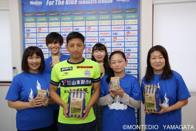 2019年10月26日弊クラブが中地区有志の会、グループ農夫の会と共に行っている山形県山辺町大蕨地区の棚田再生事業について、ホームゲーム愛媛FC戦での販売開始を前にグループ農夫の会の皆様より、棚田米の贈呈を頂きました。