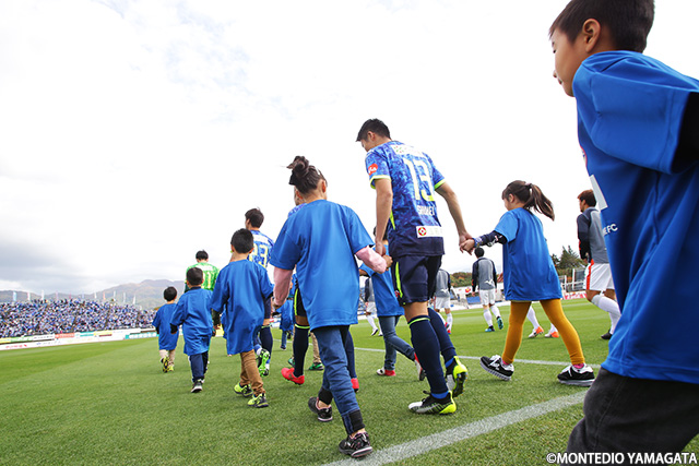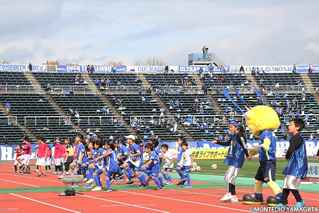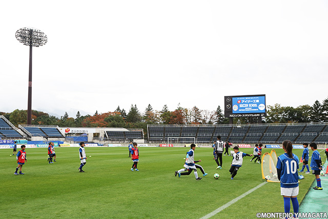 試合開始前のピッチではアイジー工業株式会社ご協賛 モンテディオ山形サッカースクールが開催され、たくさんの子供たちがモンテディオ山形選手、アカデミーコーチと一緒にボールを追いかけます。