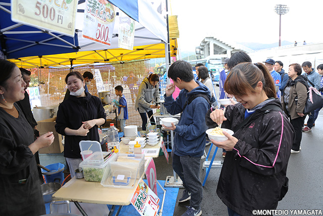 前回のホームゲーム・FC岐阜戦に続いてこの試合でも「まんぷく祭り」を開催。まずは試合前にうんまいものでサポーターのパワーをつけてもらう作戦です。この試合でのテーマは麺。「麺 MEN メン DAY」として開催されました。