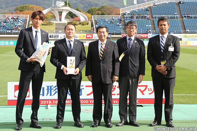この試合は村山市と南陽市の市町村応援デーとして開催。たくさんの市民の方にスタジアムにお越し頂いた他、村山市からは志布隆夫市長にご来場頂き雪室米を、